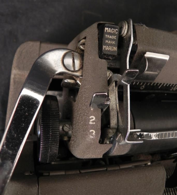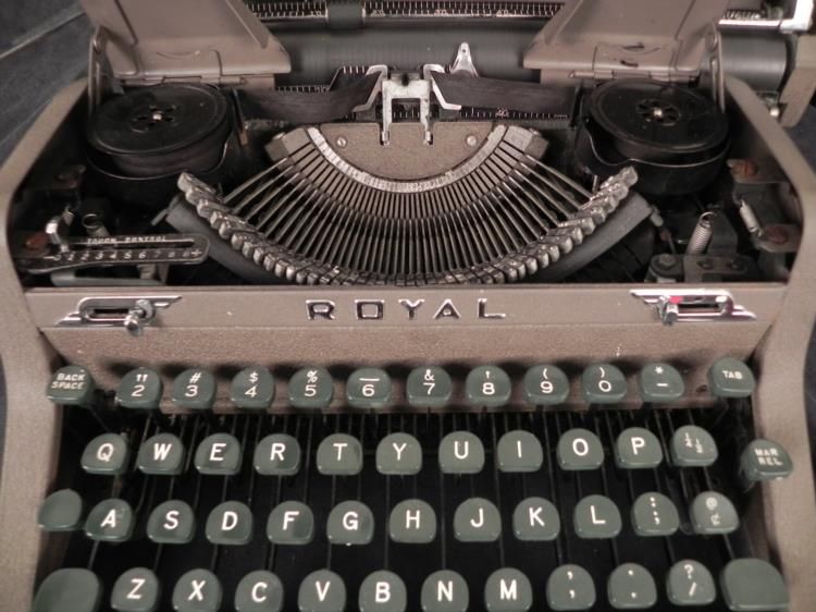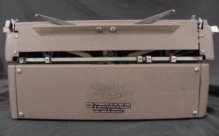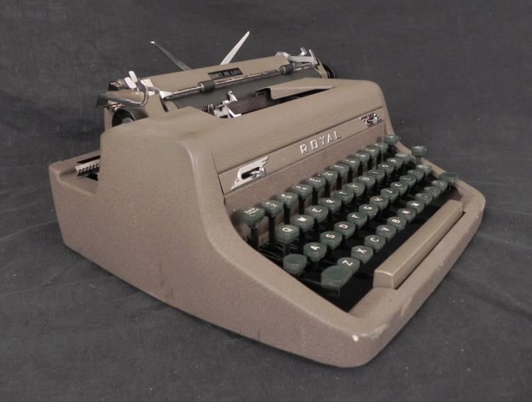 Here is a Royal brand Quiet De Luxe model vintage Manual Typewriter. This model features Red, White and Black settings, and the trademarked Magic Margin. The keys are sticking sometimes, but they strike nicely, so this typewriter just needs a good cleaning. Black ribbon is included. The body is textured olive beige metal, with green keys. There are some minor spots of discoloration in front. The width of the body is 11". * * Give your next hand-typed letter the royal treatment with this vintage Royal typewriter.