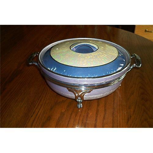 Featuring a vintage, Royal Rochester-Handpainted, baking dish with a Royal Rochester Silver Plated, 4 legged holder. It is two handled stand. Bottom of dish states: FRAUNFETTER CHINA. The silverplated stand is inscribed: ROYAL ROCHESTER. The inside lid is stamped in brown and gold lettering: ROYAL-ROCHESTER-HANDPAINTED-GUARATEED HEAT PROOF-FOR BAKING. measures 3 5/8 inches tall; Handled lid diameter measures 8 inches; bowl depth is 2 3/8 inches; opening diameter of 7 3/4 inches; Colors inclued purple, blue and a creamy verigated center and handle. Excellent condition.