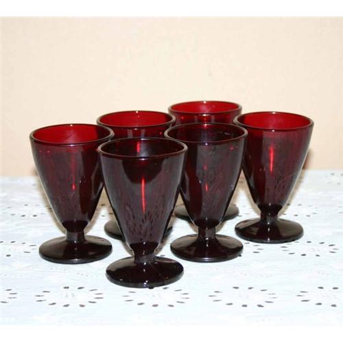Presenting a fabulous set of vintage 1940s Royal Ruby footed Wine Glasses produced by Anchor Hocking Glass Company. This set of 6 gorgeous Wine Glasses are cone shaped holding 2 ½ ounces of fluid, stand 3 3/8 of an inch tall and measure 2 ¼ of an inch across the top. Priced and sold as a set of six and in MINT condition!