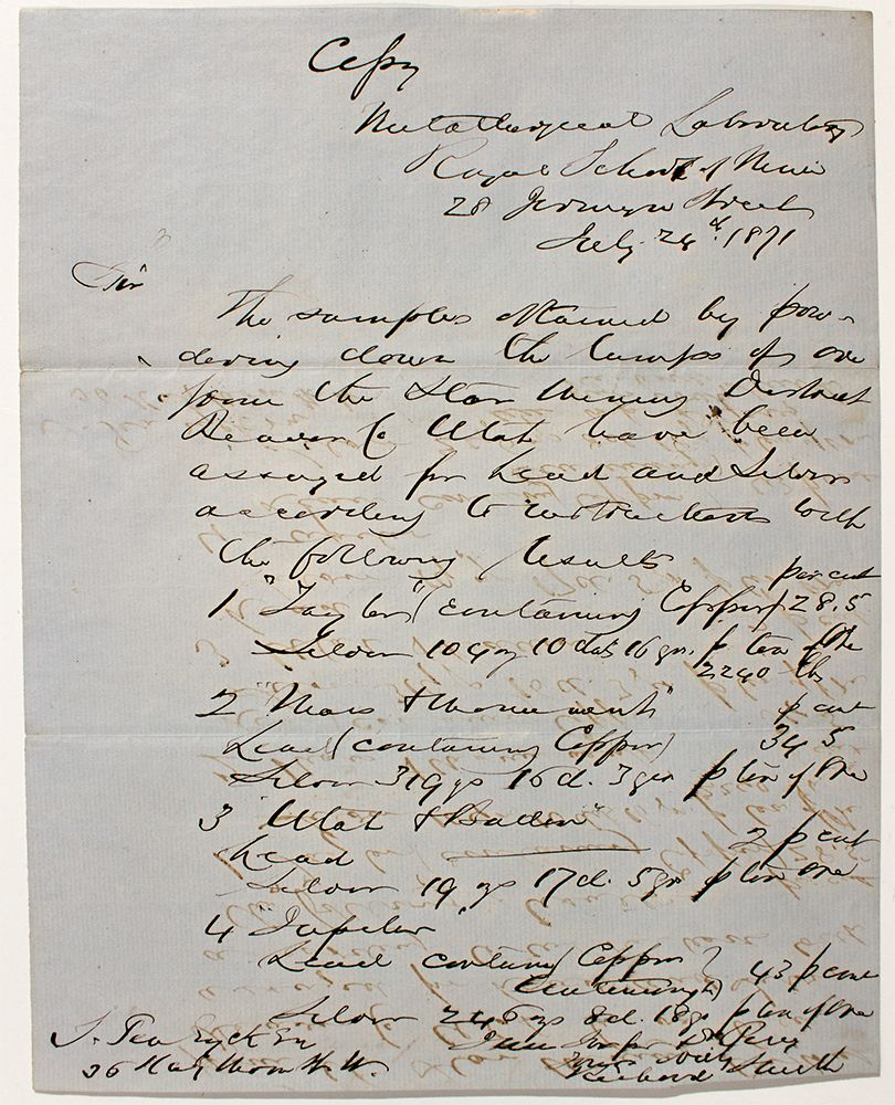 1871 Letter to the Metallurgical Laboratory, Royal School of Mines, dated July 28, 1871, regarding samples from the Star Mining District, Beaver County, Utah. This analysis letter indicates the results assayed for silver and lead content. This ancient letter is in excellent condition, and very legible. Very rare. - HKA#66122