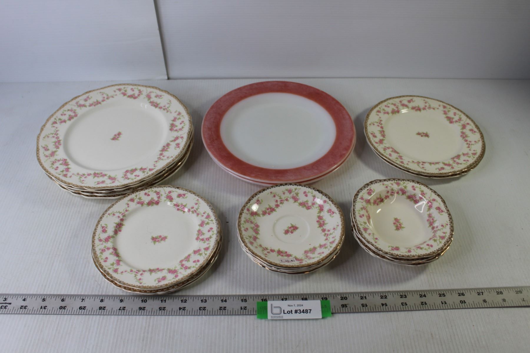 Royal Semi Porcelain "Harmony Rose" Fine China Dish Collection (4 Dinner Plates, 2 Medium Plates, 3 Small, 4 Saucers, 4 Bowls), (2) Pyrex Dinner Plates