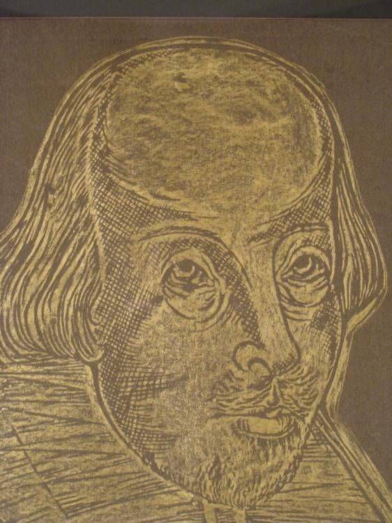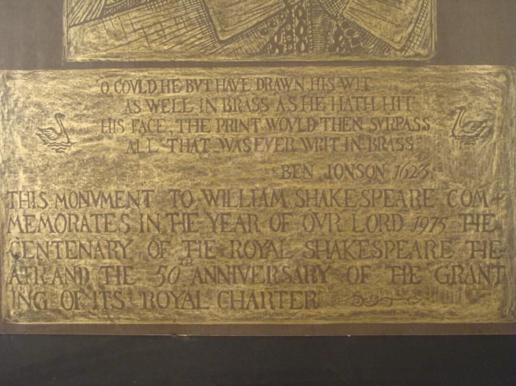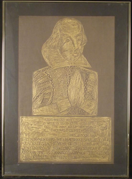 This poster was made to commemorate the 50th anniversary of the Royal Shakespeare Theatre. It features an image of the Bard, and a quote from his contemporary Ben Jonson. * Medium: Print on paperImage size: 20 × 30 1/2 * Framing: Matted in black, with gold chrome metal frameFrame size: 26 1/4 × 36 1/2 inchesCondition Excellent