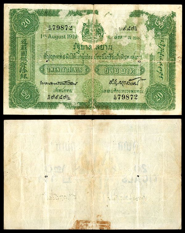 Thailand, issued note, 20 Ticals, 1.8.1919, P-11d, F-VF with hard vertical and horizontal fold though paper is strong and exhibits original embossing. Three holes can be seen. TDLR.