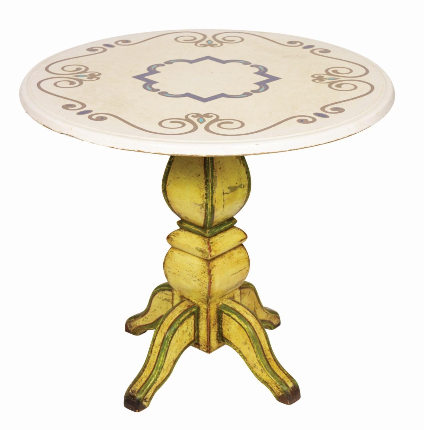 (Disneyland, c.2000s) A table from the Royal Street Veranda in New Orleans Square. Known for its bread bowls and gumbo, the Royal Street Veranda remains a popular spot with guests. The base is not original to the tabletop but was added to restore functionality to the table and is attributed to originating from Disneyland as well. Measuring 31.5" in diameter and 27.75" tall, the table is in good condition with surface wear consistent with park use, including some color wear to the design, yellowing to the center of the tabletop, and a few scratches. There is chipping around the edge throughout, and some gum on the underside. The base shows general wear to the paint.