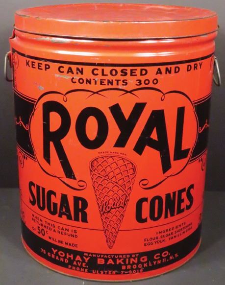 Royal Sugar Cones Store Tin. Contained 300 cones. Yohay Baking Co. Brooklyn, NY. Scratches and rubs otherwise excellent condition. 15 inches tall X 12 inch diameter.