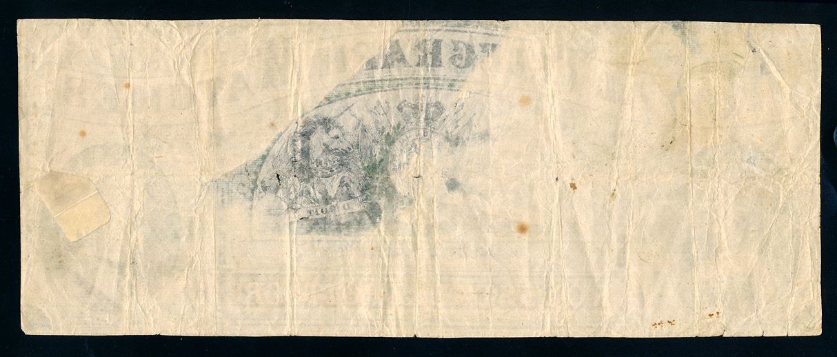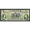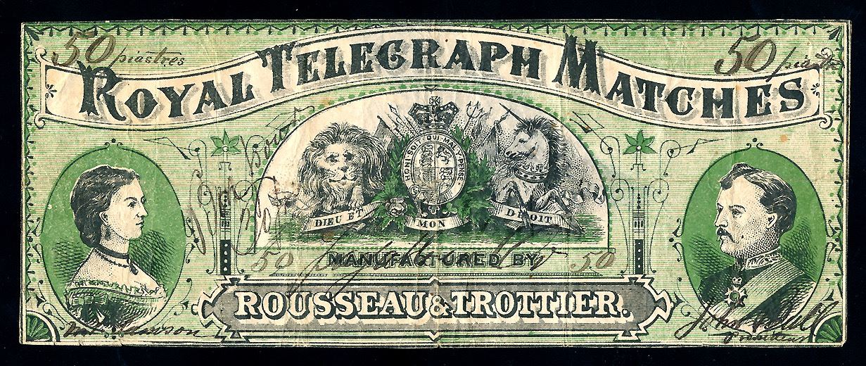 A large uniface note, 78 x 198 mm. Above, "Royal Telegraph Matches"; below, "Manufactured by Rousseau & Trottier". There is a central vignette of the Royal Arms, with a Lion to left and a Unicorn to right. There is a woman's portrait on the lower left and a man's on the lower right, possibly Royal family or the Governor - General and wife. Black on green undertype. The note is denominated as 50 Piastres, although it is possible that the word "Piastres" has been added by hand. In fact, the whole note has a kind of hand - engraved appearance, through it is in fact printed. We can find no references to this note, nor to either "Royal Telegraph Matches" or "Rousseau & Trottier". This is surely a rare item, and possibly unique.