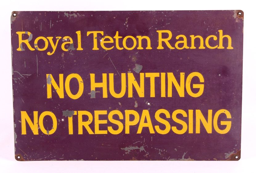 This lot features an original Royal Teton Ranch sign. The Royal Teton Ranch is owned by the Church Universal Triumphant and located just north of Yellowstone National Park near Gardiner Montana. This sign is in good condition. It measures 12" x 18".