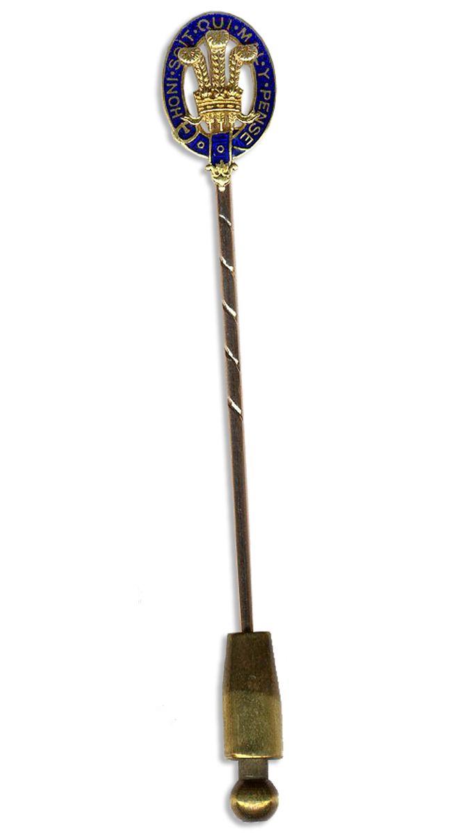 Tiepin with gold Prince of Wales feathers surrounded by an oval intaglio of the Most Noble Order of the Garter, the highest honor the United Kingdom offers. Blue enamel intaglio in the shape of the Garter bears its motto in gold letters: ''Honi soit qui mal y pense'', Middle French translating approximately to, ''shame upon him who thinks ill of it''. Measures 3'' in length and nearly 0.5'' across the decoration. Some tarnishing to metal fastener at the bottom, else near fine. Provenance from Sotheby's auction of The Jewels of the Duchess of Windsor, held in Geneva on 3 April 1987, lot 178.