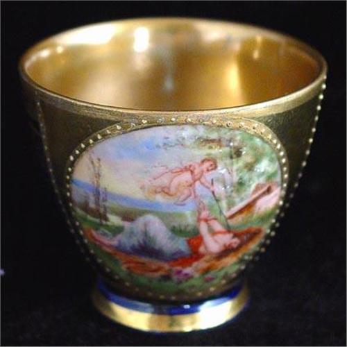 Royal Vienna cobalt blue and gold single demitasse. Richly decorated with gilt and a medallion depicting a hand-painted classical scene of mother and child. Part of a matching set that includes small coffee cups and saucers (demitasse) and a sugar bowl, all listed separately. It is marked on the underside with the blue, under-the-glaze beehive mark characteristic of authentic Royal Vienna porcelain. Price is reduced due to small interior rim restoration. In good used condition with minor signs of wear as shown. Please ask questions, request additional photos and shipping costs before buying.