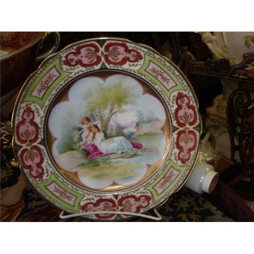 Royal vienna Plate 91/2" diameter signed W.Groschl artist signature marked beehive in red with Austria . .Colors burgandy,green gold pink. classic scene with maiden and cherub. Elaborate hand painted border