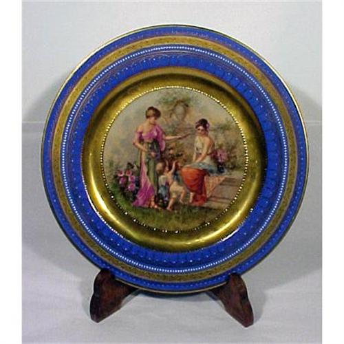 Glorious large Royal Vienna decorated cabinet plate, 10 ¾? diameter plate is profusely decorated with the scene of two women and cupid. The women are elegantly dressed in an incredibly manicured and colorful garden. On the back with the blue over glaze beehive mark is the title of ?The Disarmed God of Love? which expalins the scene on the plate in red. I couldn?t capture the richness of the colors in this plate, so it starts with a gold enameled outer edge, with a ring of incredibly vivid ocean blue that has applied white enamel jewels, then a wide border of gold enameling with a low burnish & higher burnishes trailing vines, another ocean blue border with applied white enameling, then two gold enamel rings interspersed with white enameled jewels then a wide lush band of heavy rich gold enameling. The plate is signed on the front bottom right ?Seele?. Overall this plate is in very good condition, but a few of the gold enameled beads around the outside and inside of the interior gold enameling rim have been rubbed down a long with some rubbing to the gold enamel rim at 3, 10, 11 o?clock.