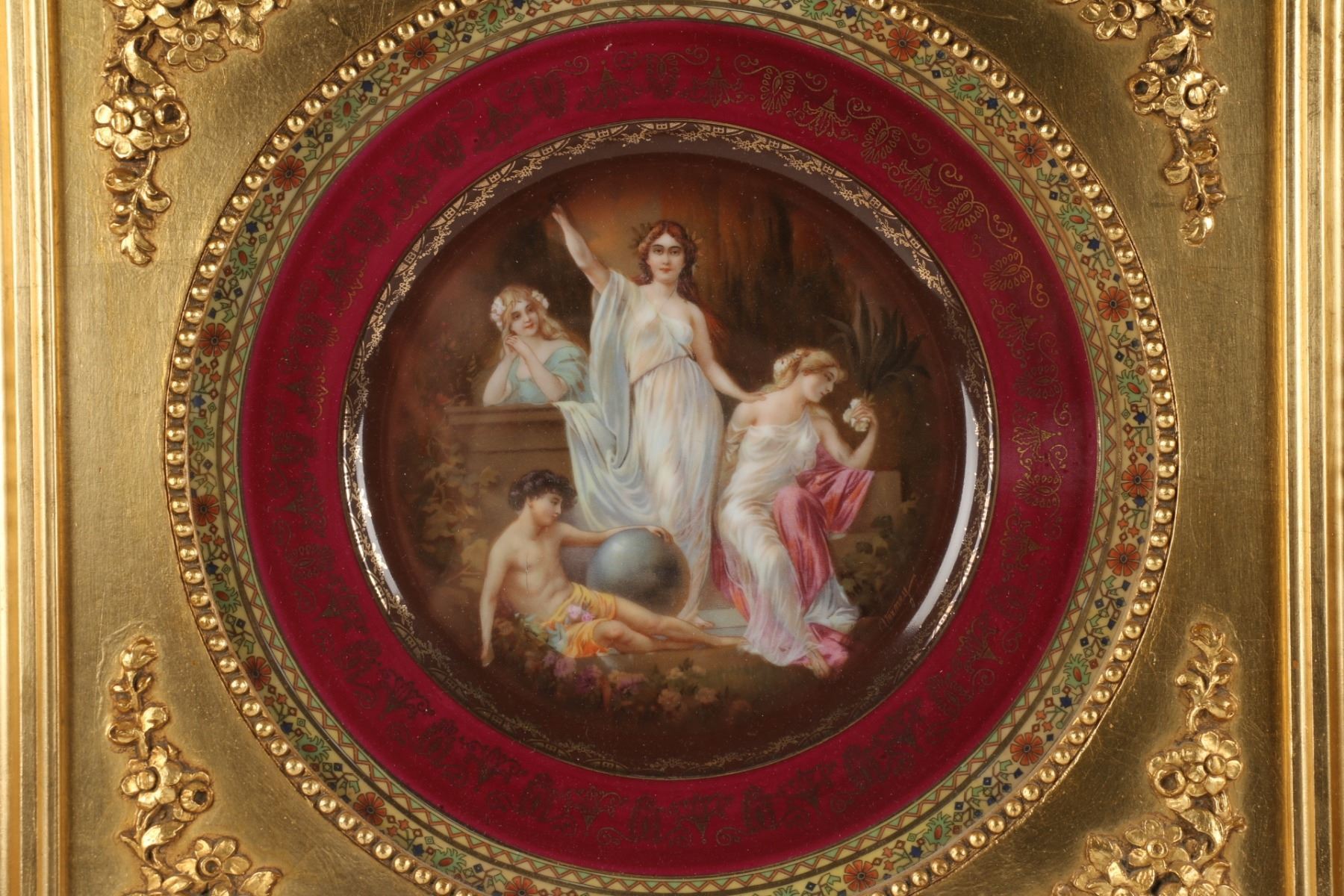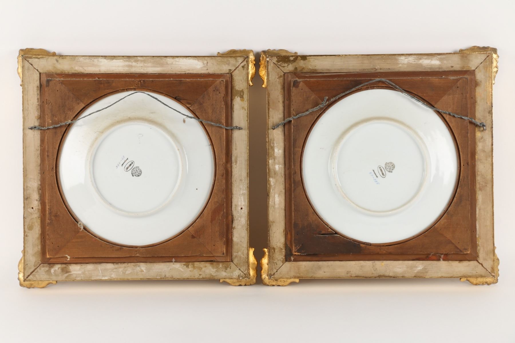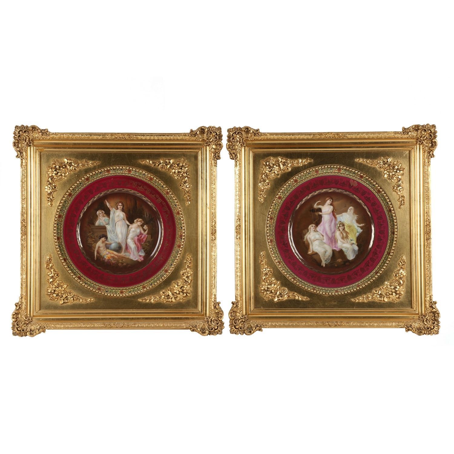Lot 72 - Pair (2). In matching gilt frames, depicting four Romanesque females, artist signature on plate front 'Verney', 'FBS' in circle mark for Ferdinand Bing & Co., with Czechoslovakia below, also Rembrandt, hand-painted and 51-105. Frames 16" square. $200-300.