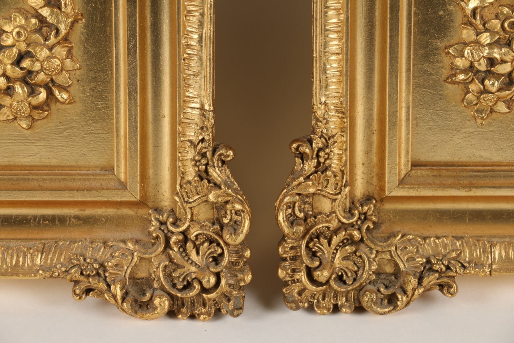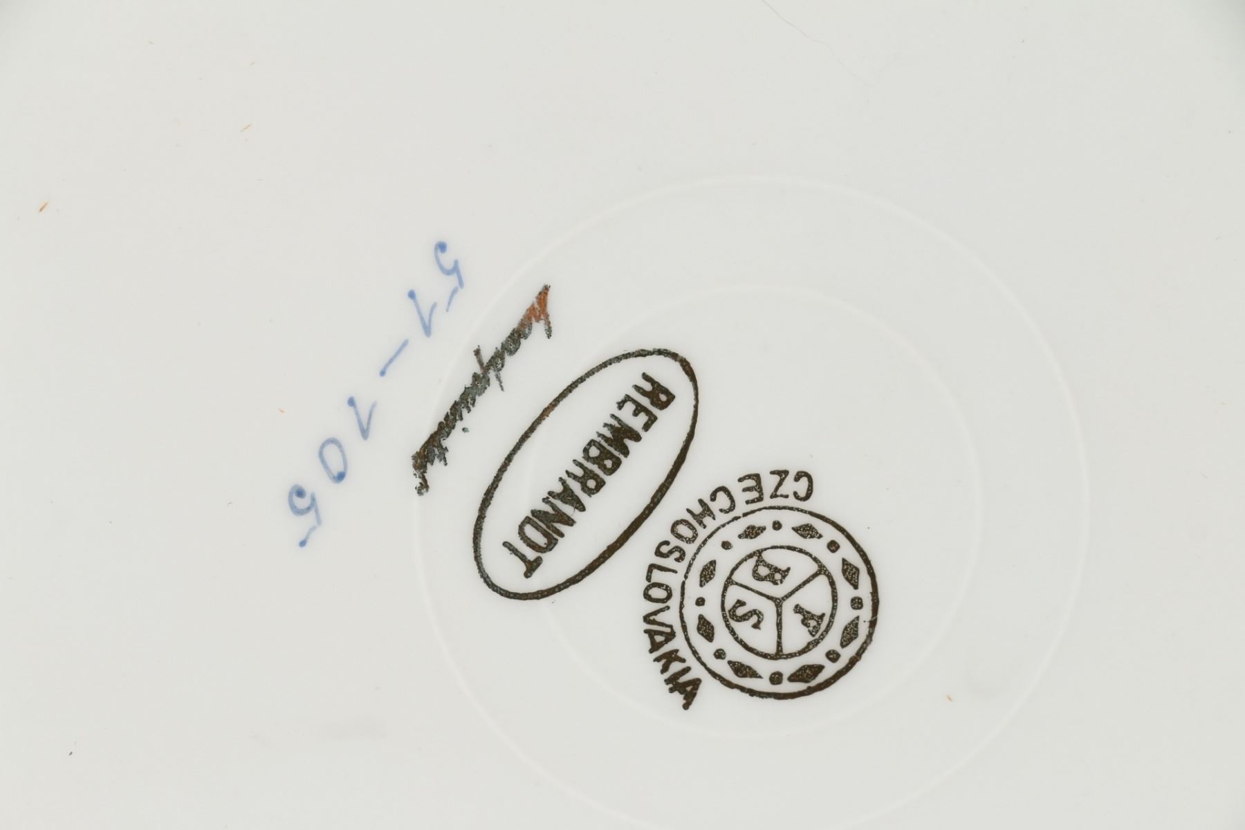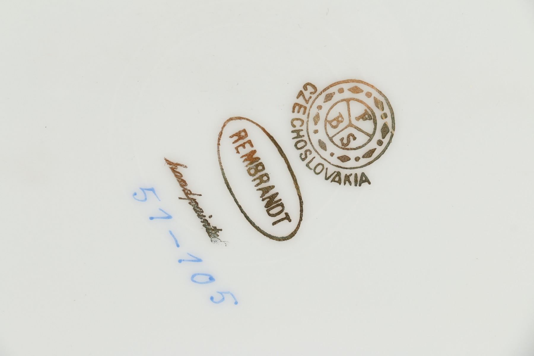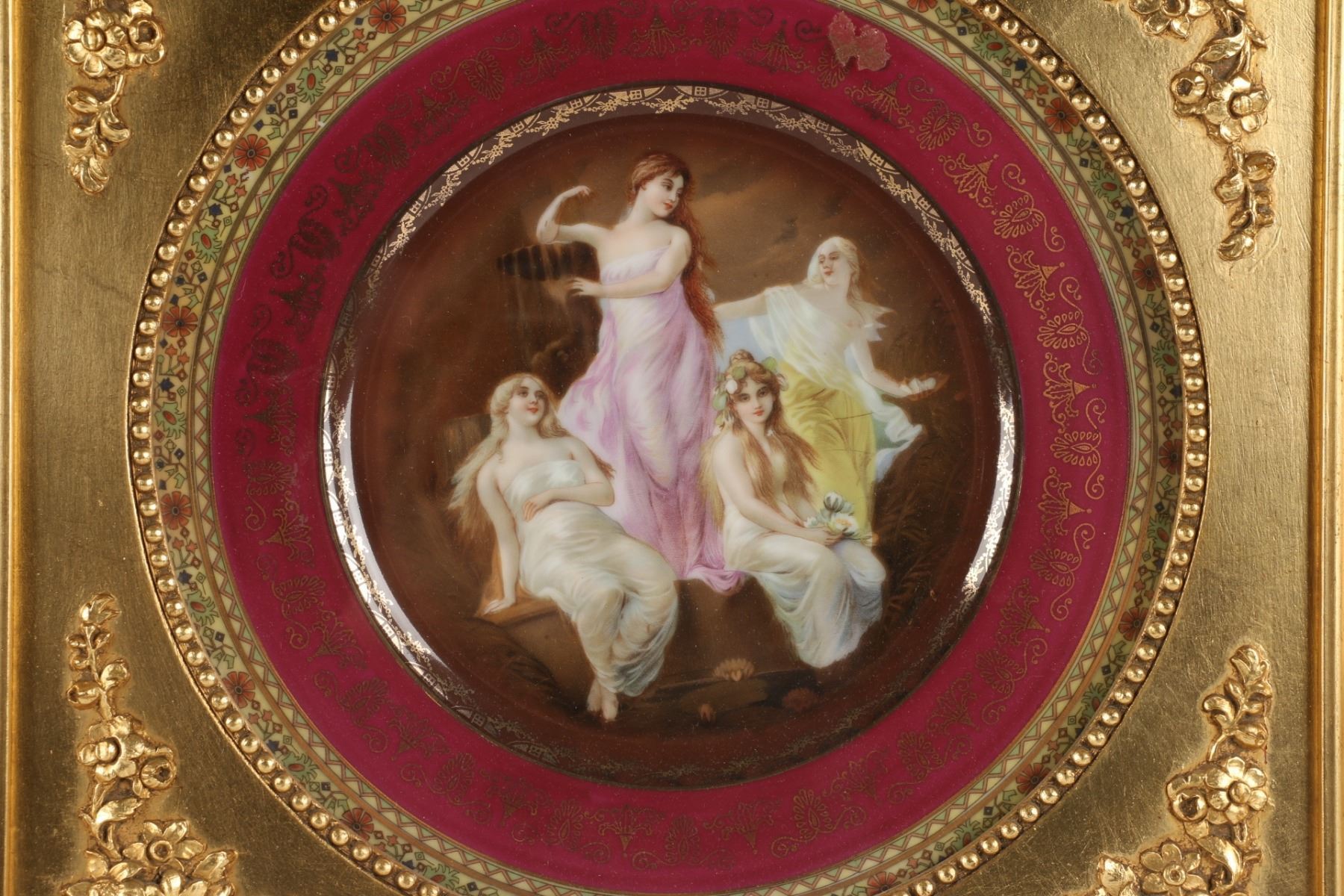 Lot 72 - Pair (2). In matching gilt frames, depicting four Romanesque females, artist signature on plate front 'Verney', 'FBS' in circle mark for Ferdinand Bing & Co., with Czechoslovakia below, also Rembrandt, hand-painted and 51-105. Frames 16" square. $200-300.