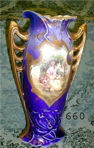 Royal Vienna cobalt 8 7/8” vase with gold handles and gold outlined portrait shied of a woman with a fan. Embossed leaf and floral designs at base.