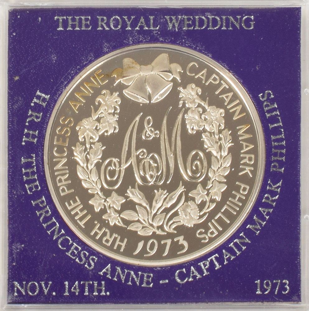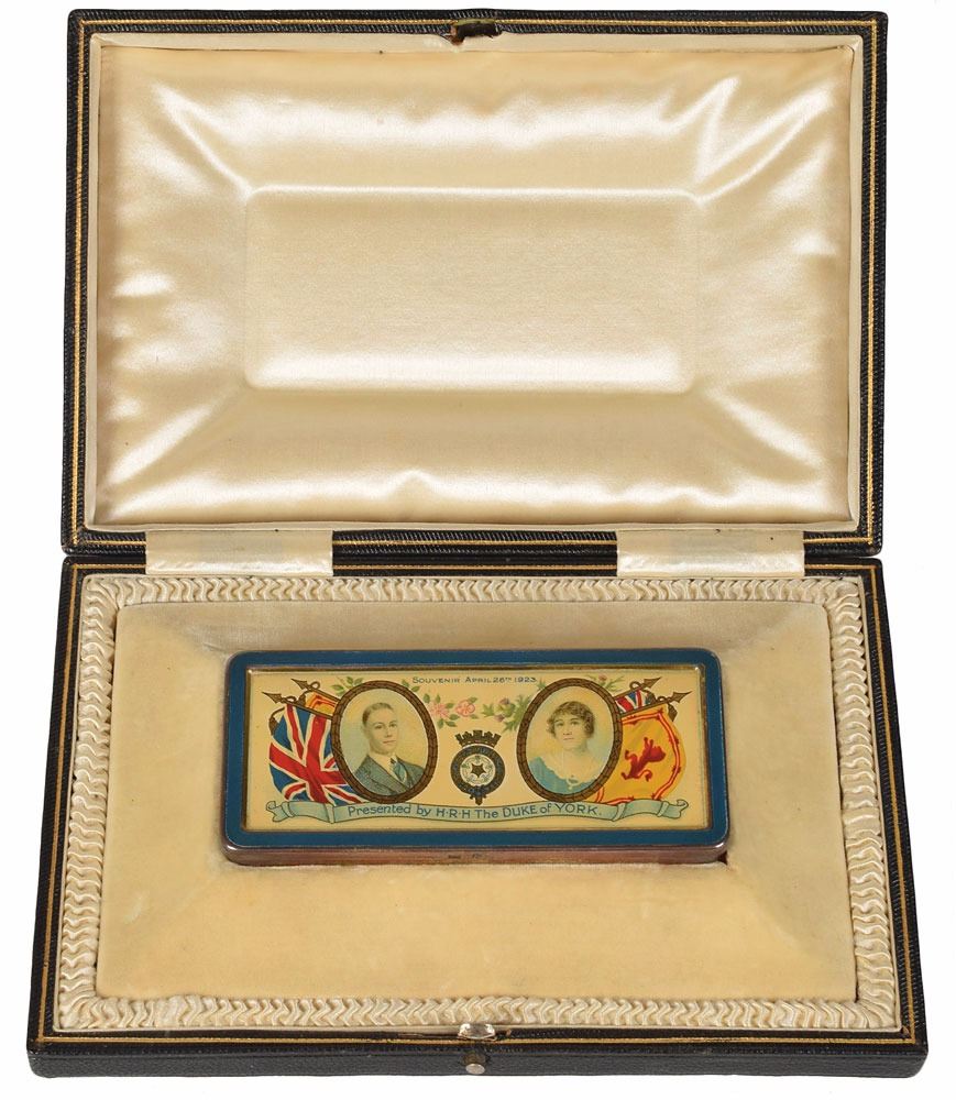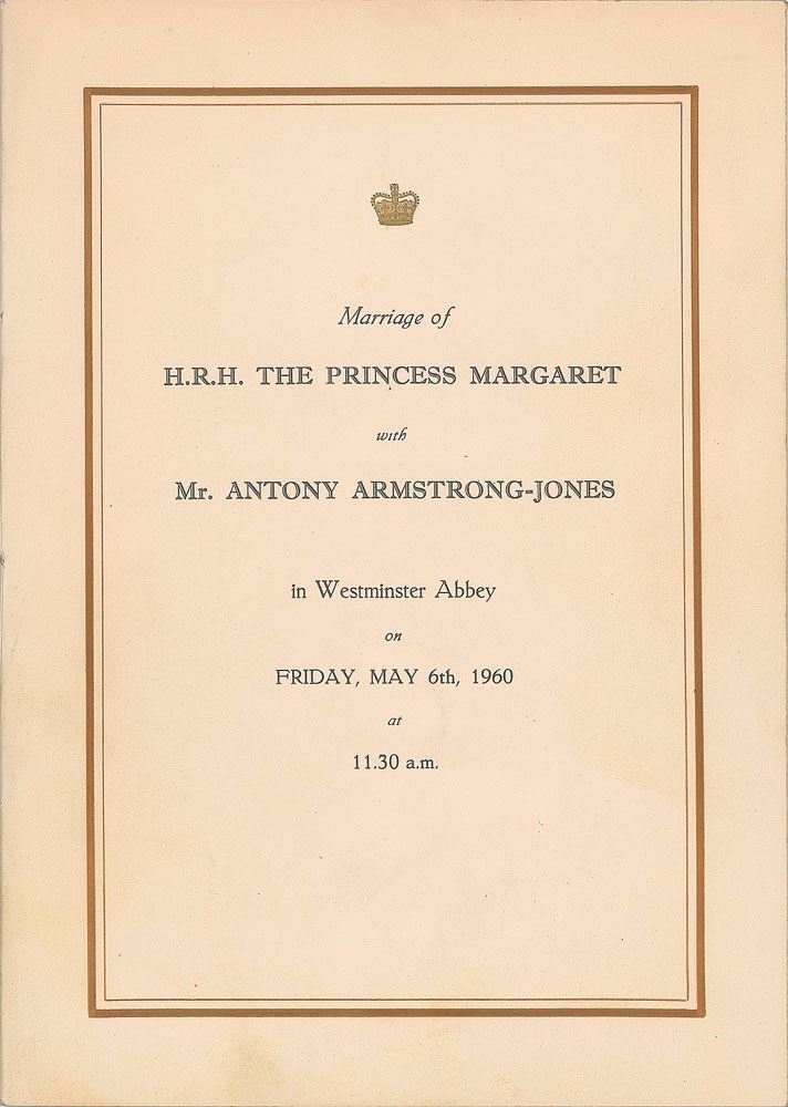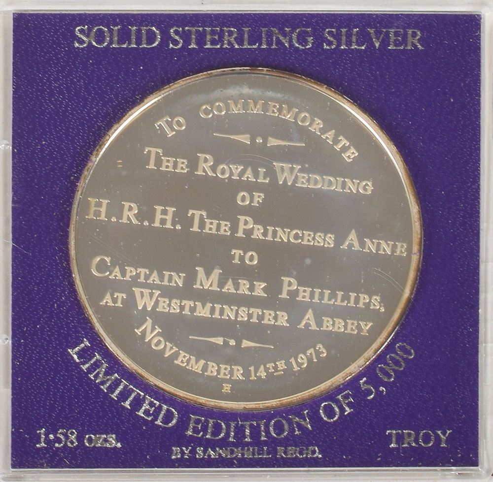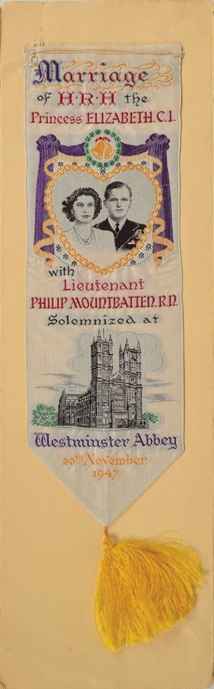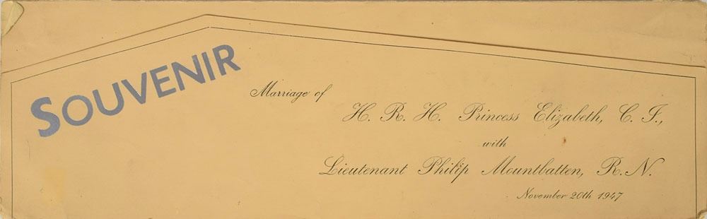Collection of four commemorative souvenirs for royal weddings: a souvenir silver tin from the wedding of Prince Albert, Duke of York (later King George VI) and Lady Elizabeth Bowes-Lyon (later Queen Elizabeth The Queen Mother) on April 26, 1923, presented in its original black case; a souvenir embroidered silk ribbon from the wedding of Princess Elizabeth (later Queen Elizabeth) and Lieutenant Philip Mountbatten (later Prince Philip) on November 20, 1947, in its original folder; a program from the marriage of HRH The Princess Margaret and Mr. Antony Armstrong-Jones on May 6, 1960; and a limited edition sterling silver coin honoring the marriage of Princess Anne and Captain Mark Phillips on November 14, 1973, limited to 5,000. In overall fine condition.