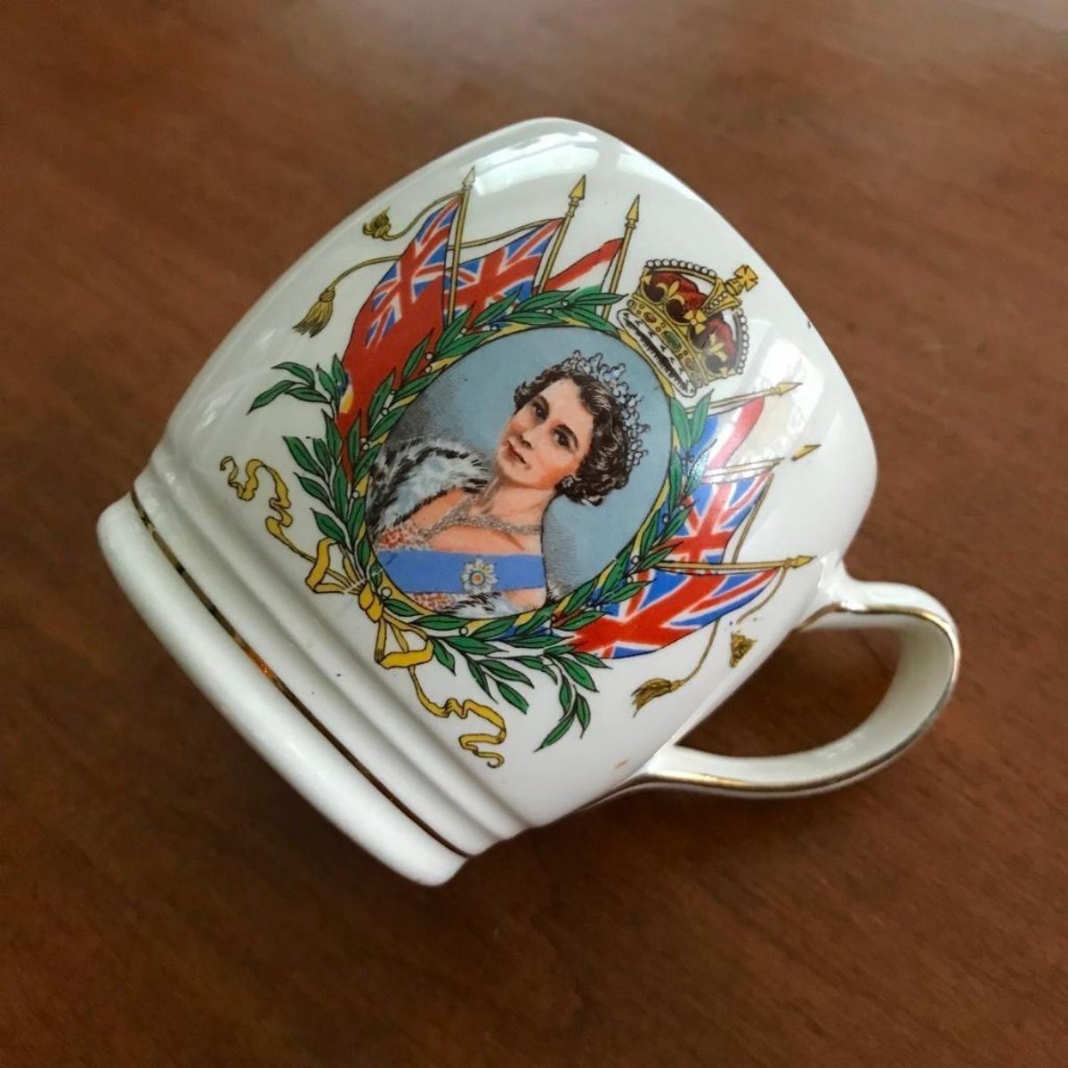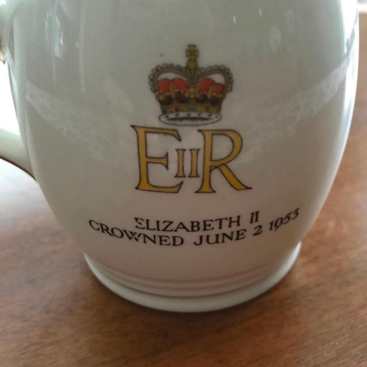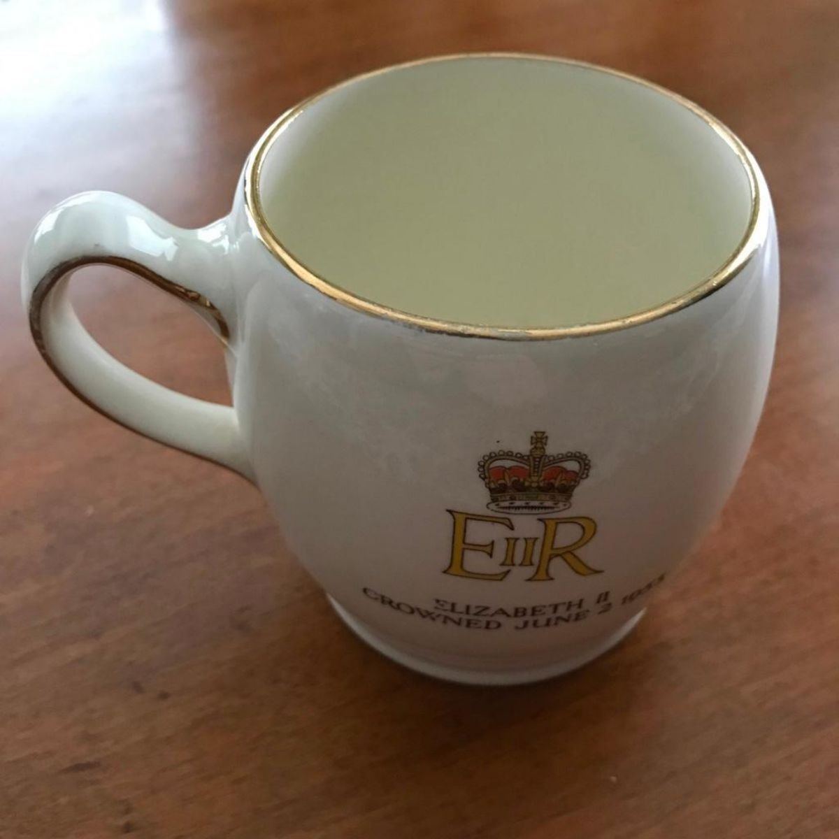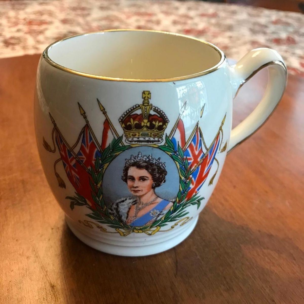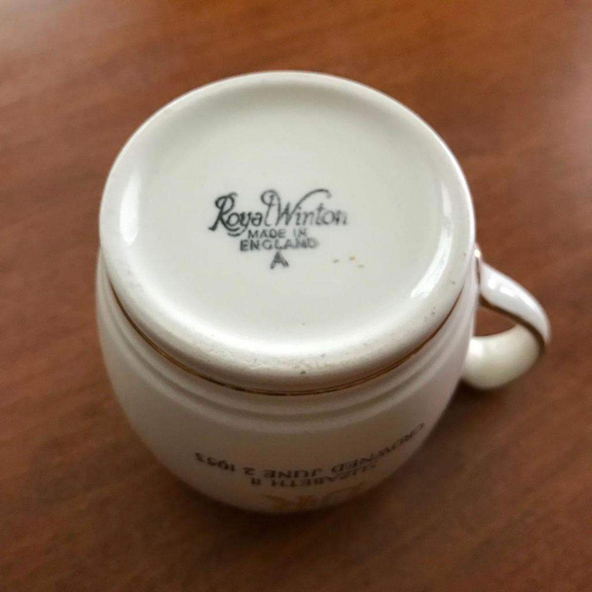 Queen Elizabeth II 1953 Commemorative Coronation mug. Porcelain with gilt edging, a portrait of the Queen on one side & the coronation date ( June 2, 1953 ) on the other. Royal Winton, Made in England stamped on the bottom. 3 1/4" H x 4 1/4" across from edge of handle.Â