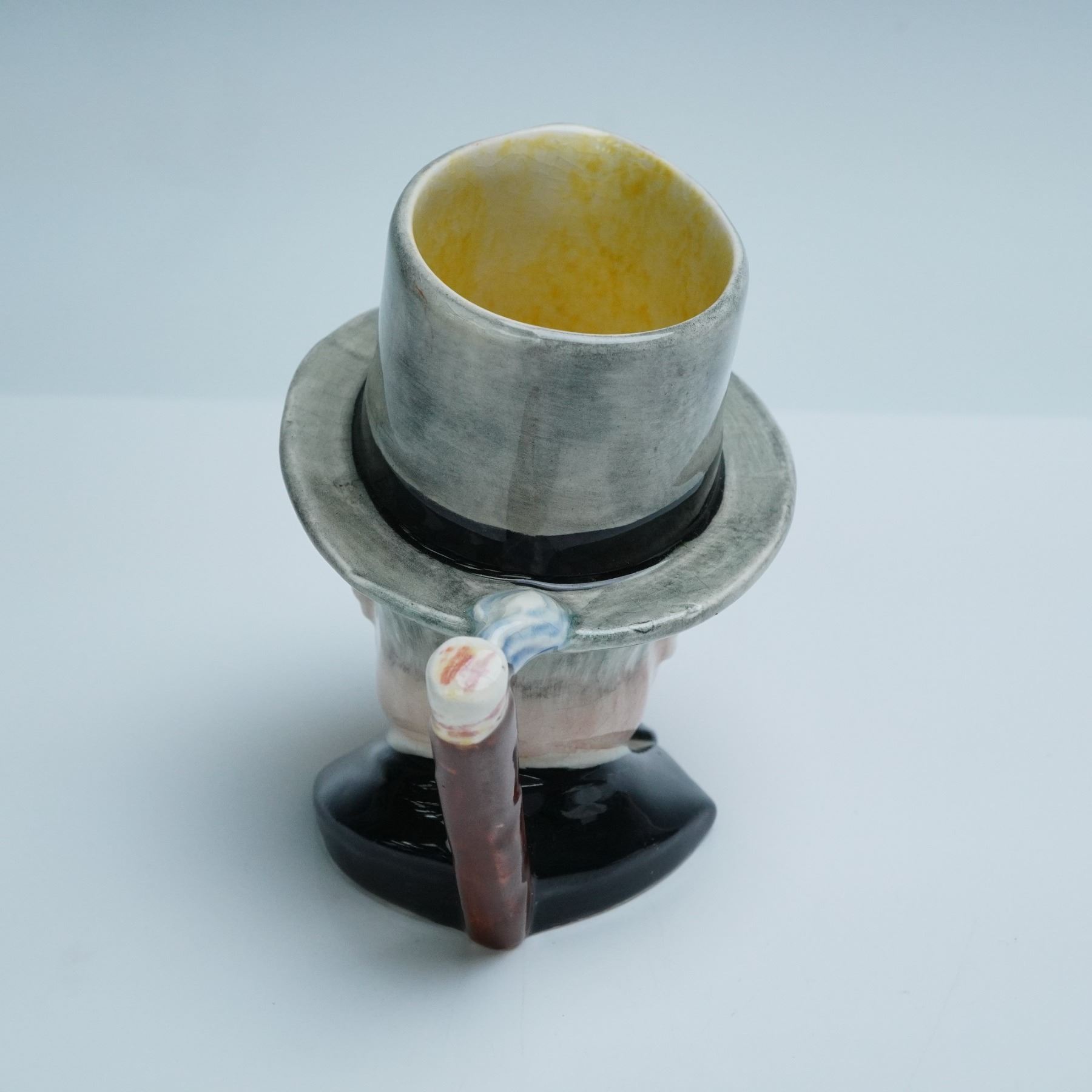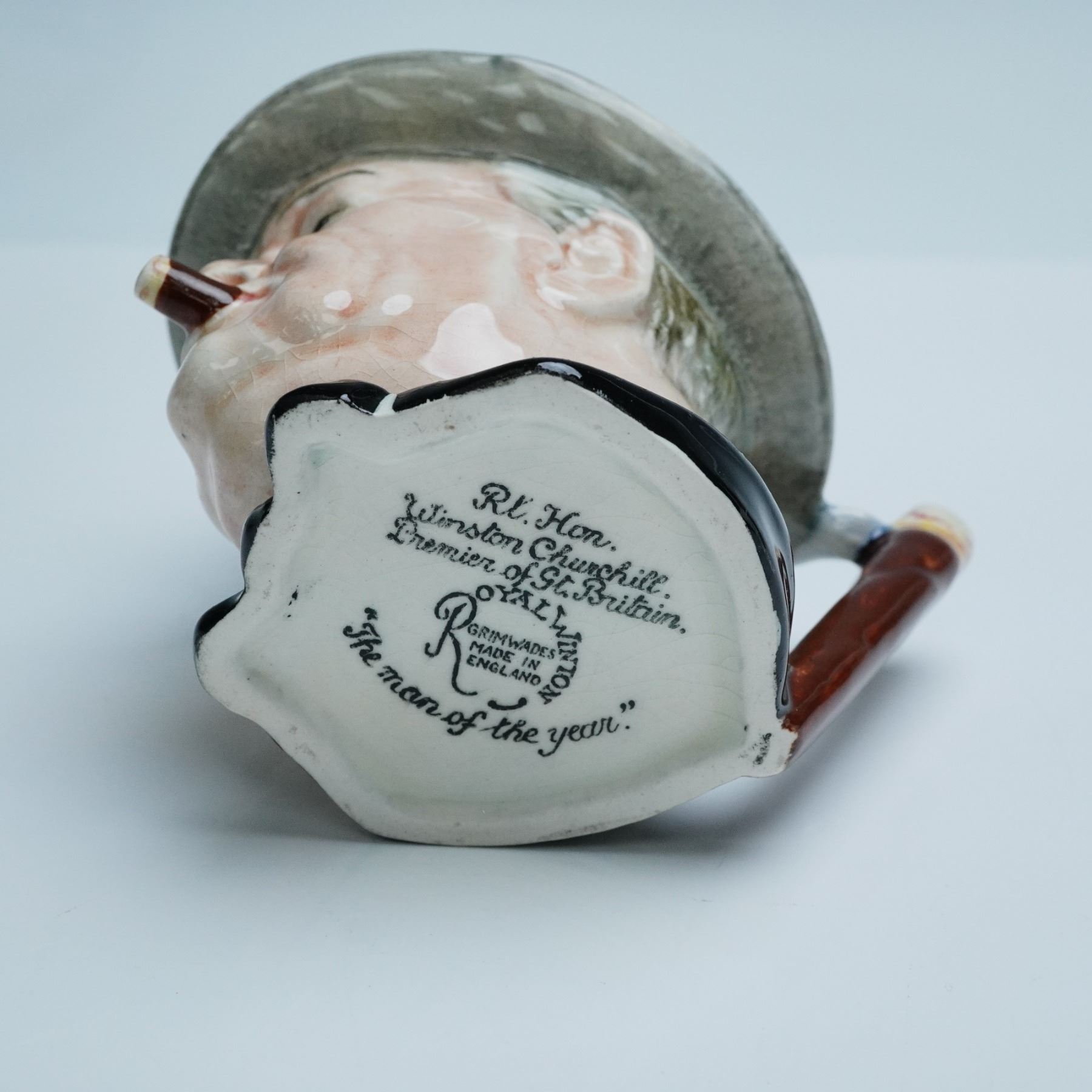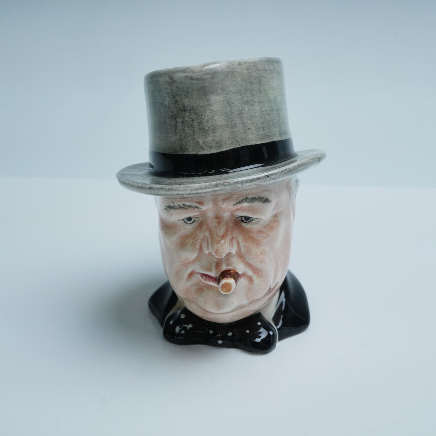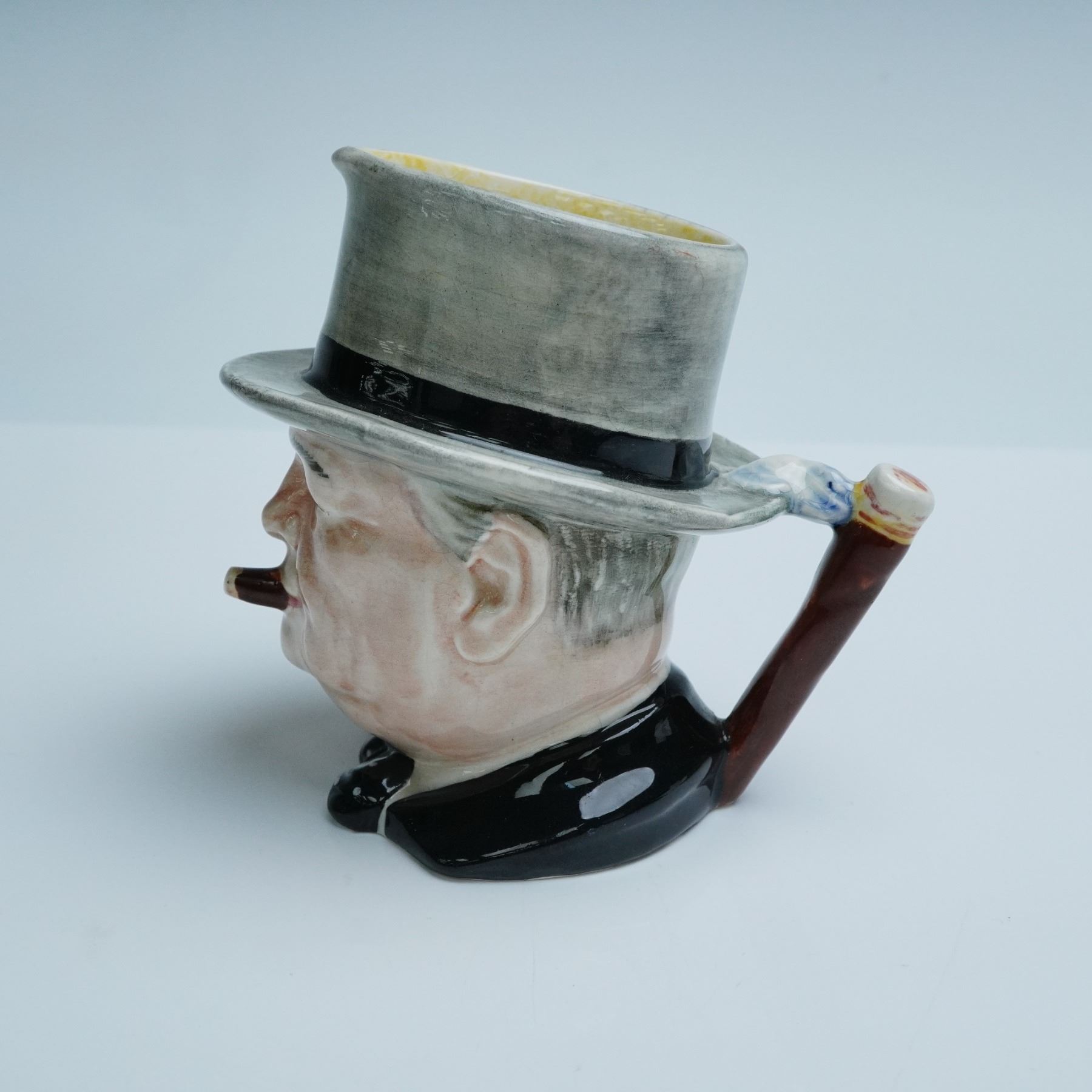 A small figural character jug portraying Sir Winston Churchill in a dignified bust format, distinguished by the unique grey top hat. He is rendered with nuanced hand-painting, including subtle facial modeling and a prominent sculpted cigar. The handle takes the form of a cigar. Royal Winton backstamp.