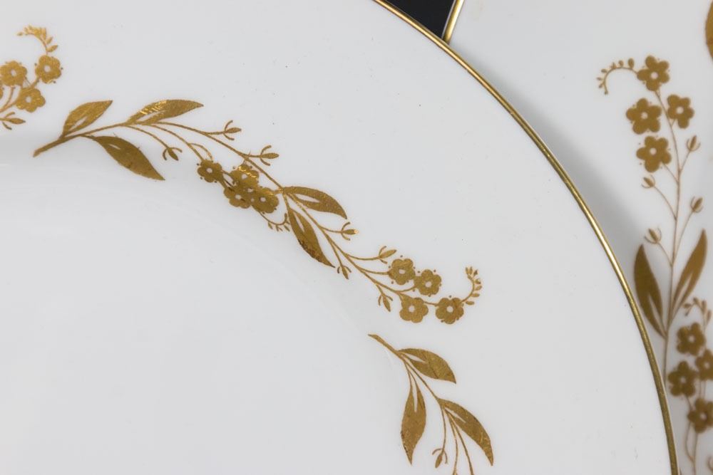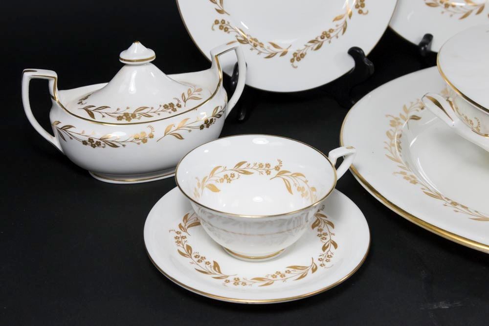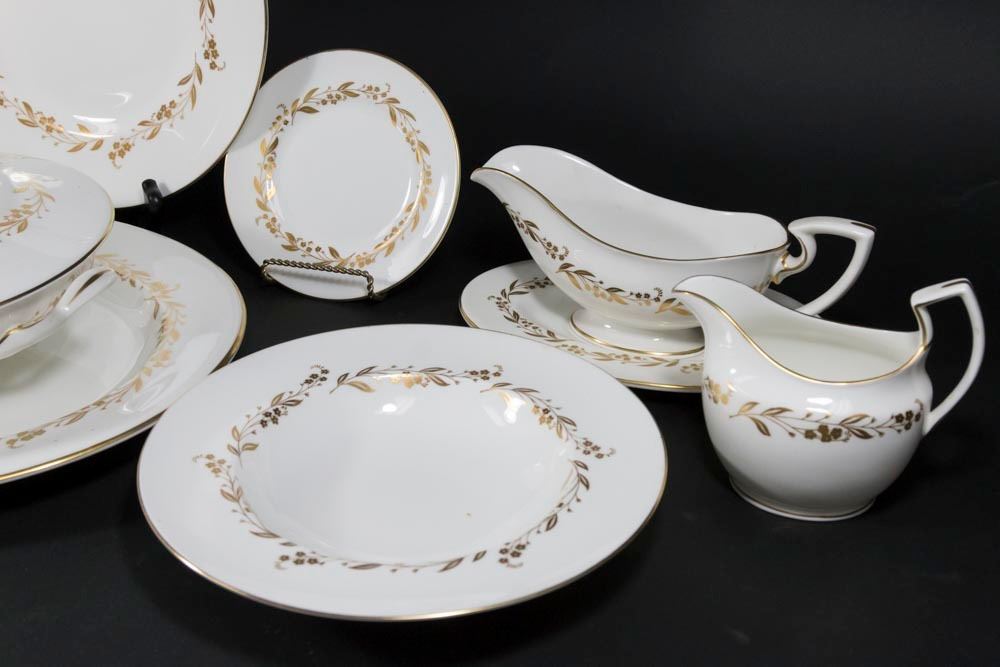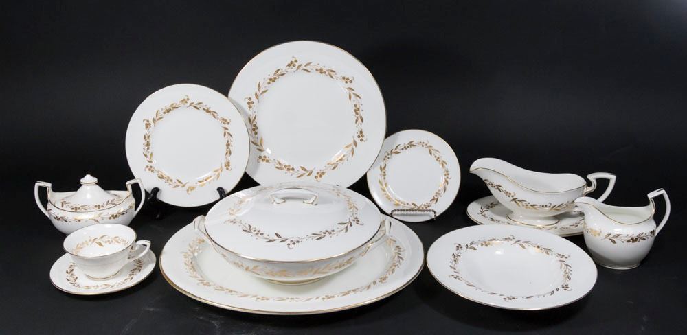 With extras. 12 dinner plates, 12 soup bowls, 18 luncheon plates, 12 cake plates, 18 cups, 18 saucers, sugar, creamer, gravy boat with underplate, platter, and covered tureen. (6160)