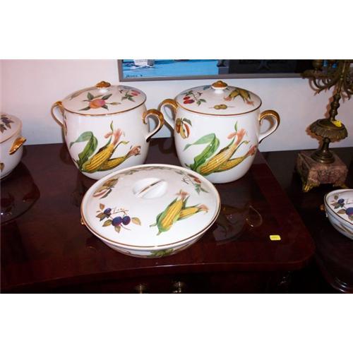 A complete set of vintage Royal Wocester fine china dinnerware in excellent signed condition. This EvESHAM set has fruit, veggies and gold trim, a known favorite of Lady Princess Di. There are 266 pieces, many covered casseroles, bakers, serving utensils, cruets, cannisters, teacups, saucers, plates, desserts, egg coddlers, soup coupes, sugar, creamer, salt, pepper, ruffled bowls and many, many more pieces. Appraised value is over $5500.