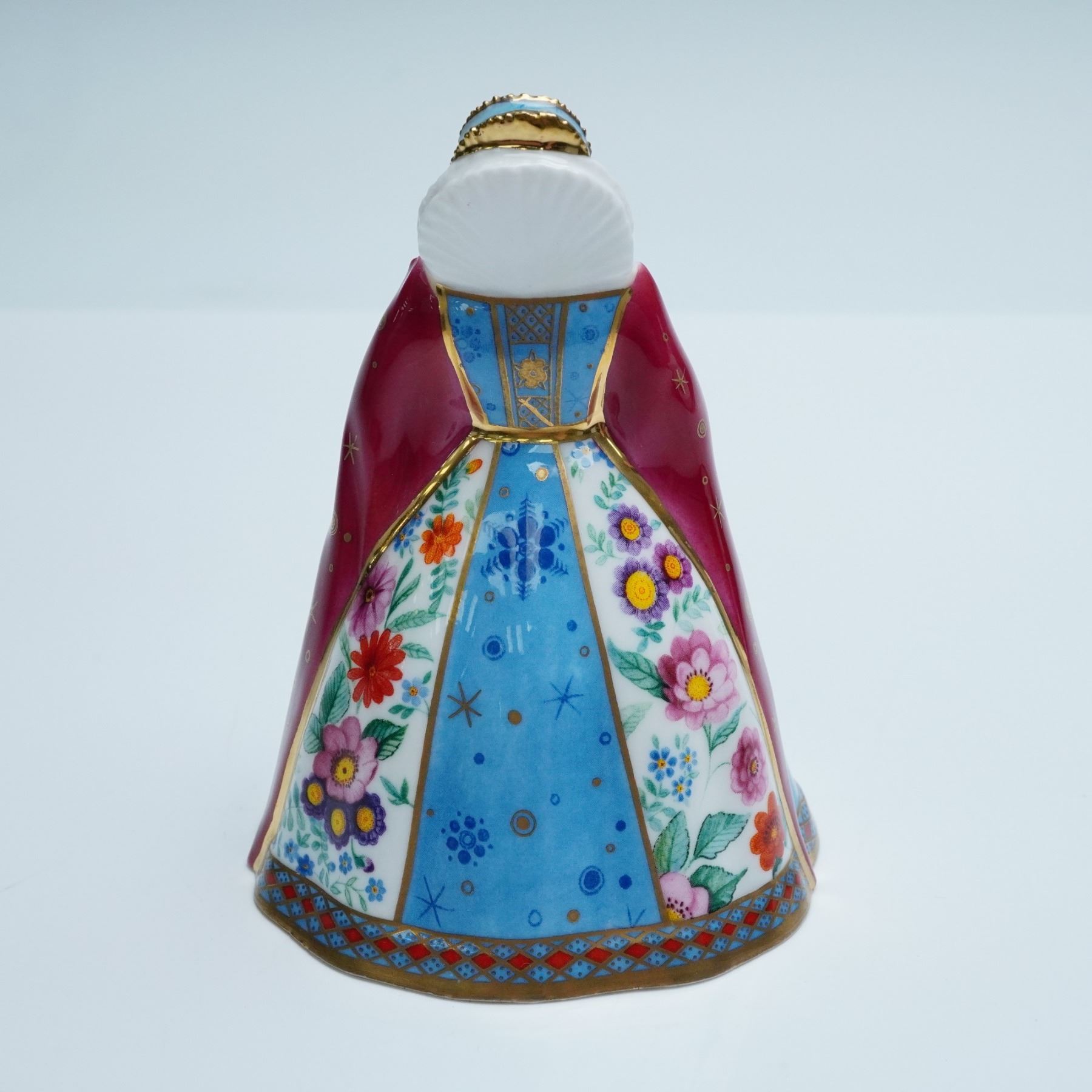 A porcelain candle snuffer intricately modeled as Anne Boleyn, the second wife of King Henry VIII, and is part of The Connoisseur Collection. The figure is attired in a richly decorated Tudor gown, featuring alternating panels of sky blue brocade patterned with gilt stars and medallions, and vertical bands of vividly enameled floral sprays. The robe is framed by a voluminous crimson cloak, edged with finely applied gilding. Her head is adorned with a jeweled French hood, and her neckline is encircled by a delicate chain; gilt throughout. Royal Worcester backstamp.
