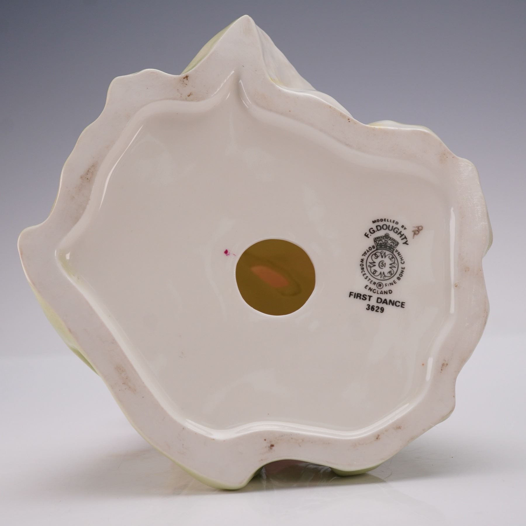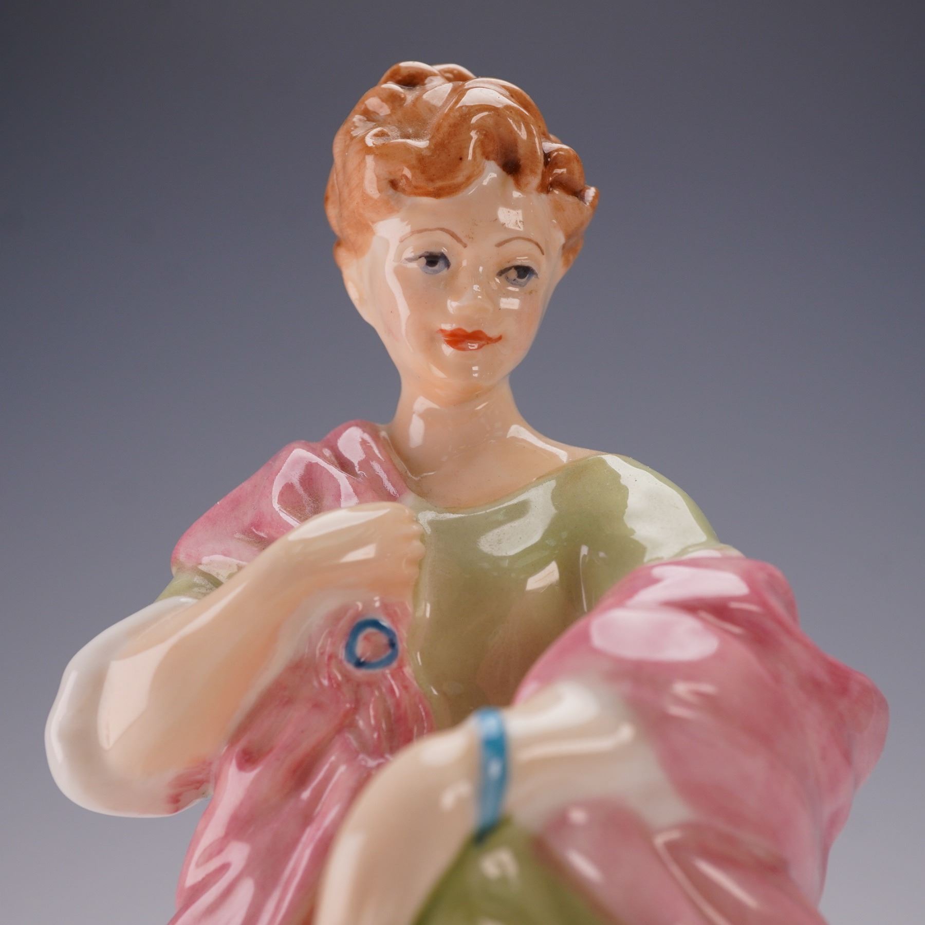 Features the Royal Worcester backstamp on the underside, along with the model name and number. The hand-painted porcelain figure depicts a lady in a flowing green gown with a pink shawl, detailed with painted tassels and accents. Her auburn hair is styled neatly, and she is posed holding her gown gracefully as though in motion. The figurine is finished in a glossy glaze, highlighting the folds and movement of the dress.