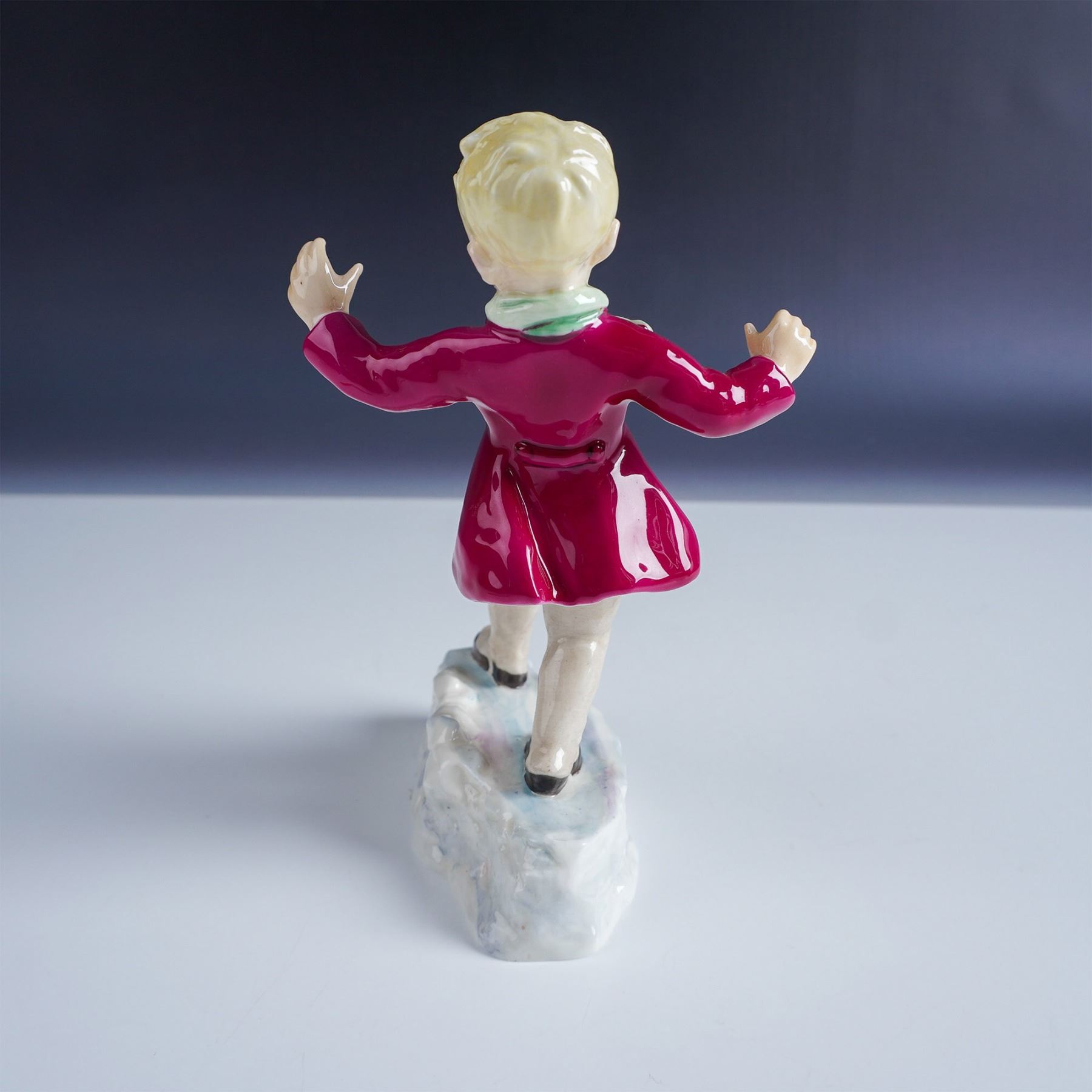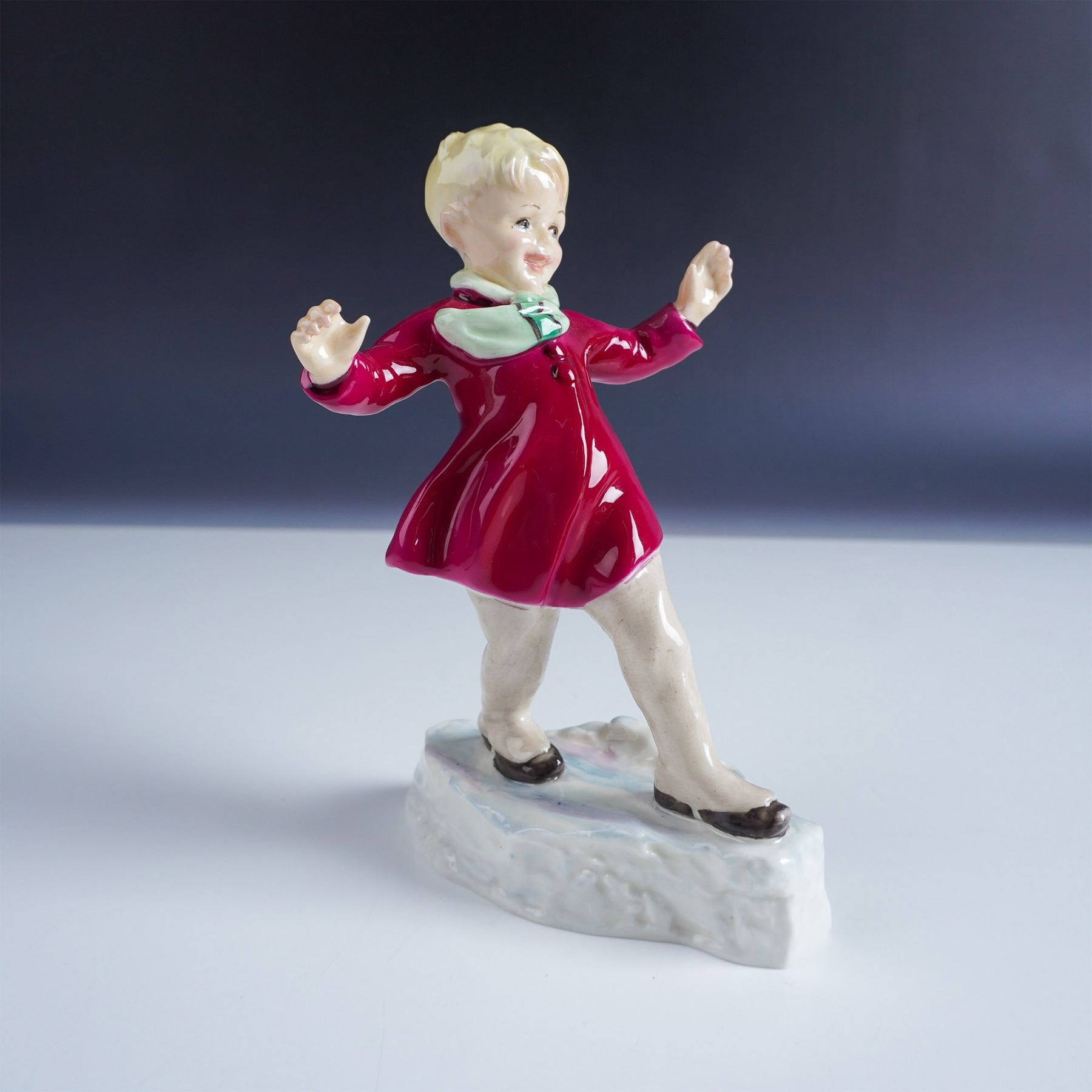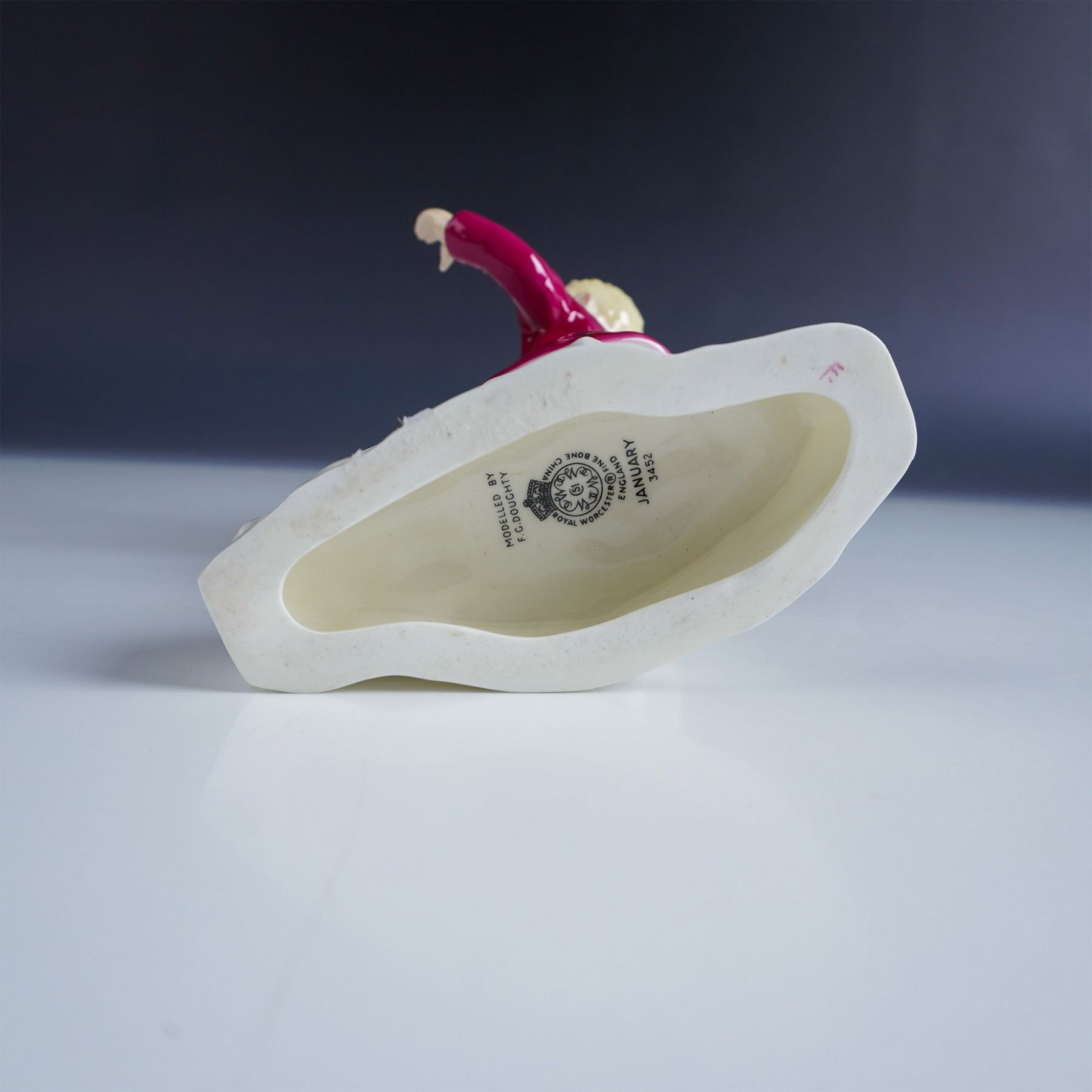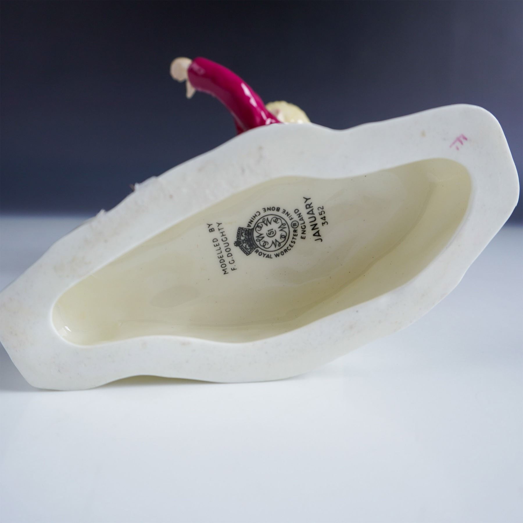 This delightful Royal Worcester bone china figurine, titled January (3452), is part of the months of the year collection and was modelled by renowned artist F.G. Doughty. The figurine depicts a cheerful child in a red coat and green scarf, skillfully ice skating, embodying the charm and spirit of winter. The underside is marked with the Royal Worcester backstamp, affirming its authenticity.