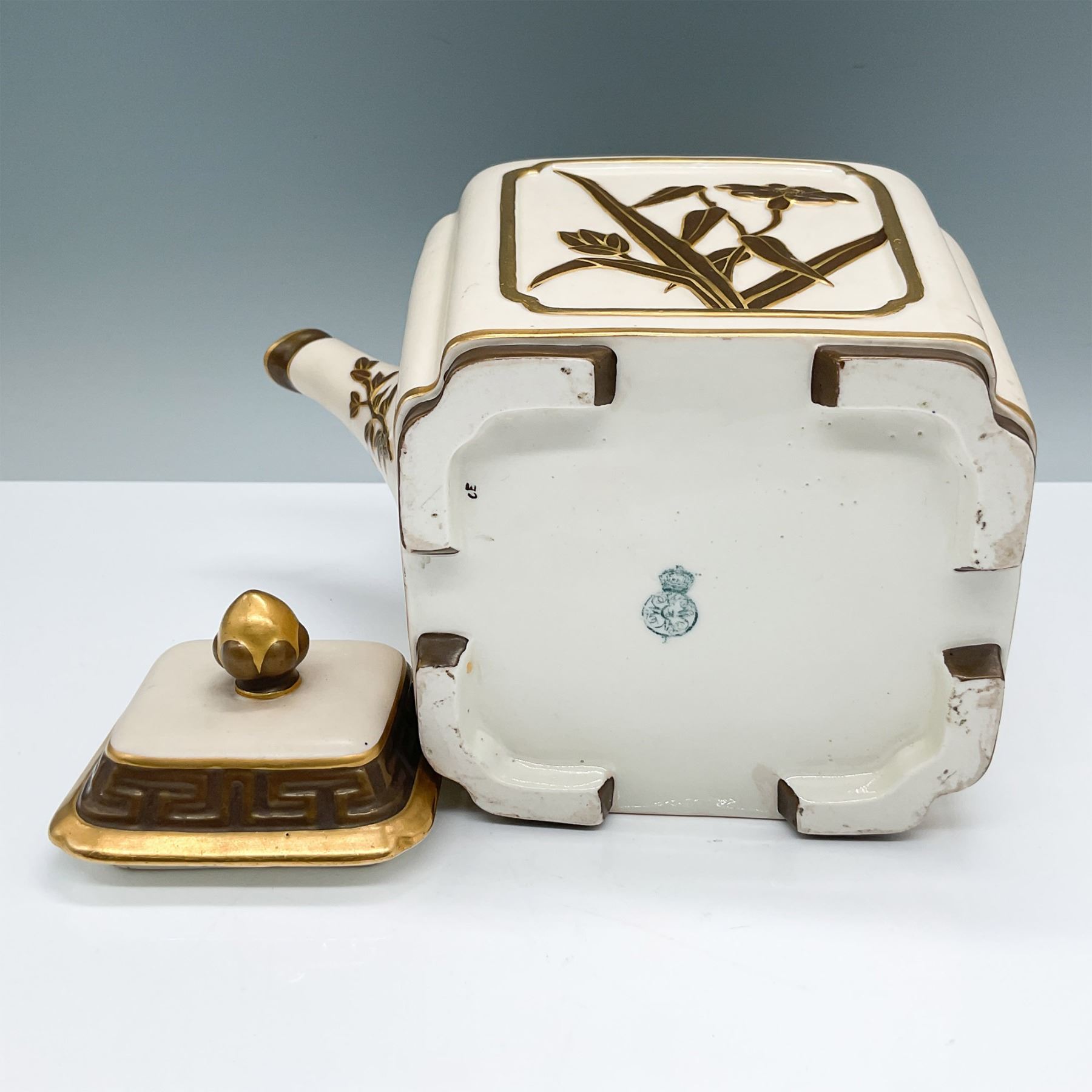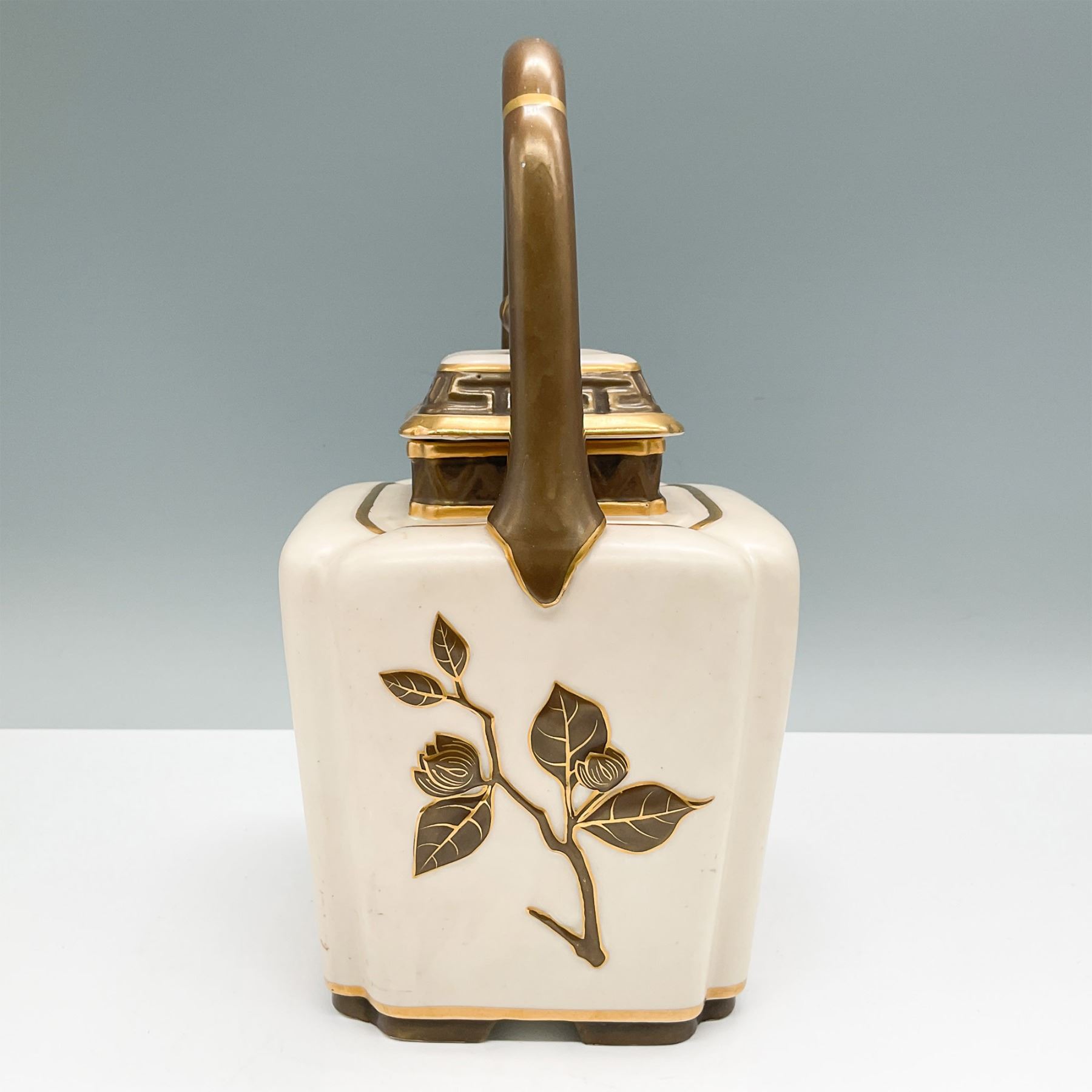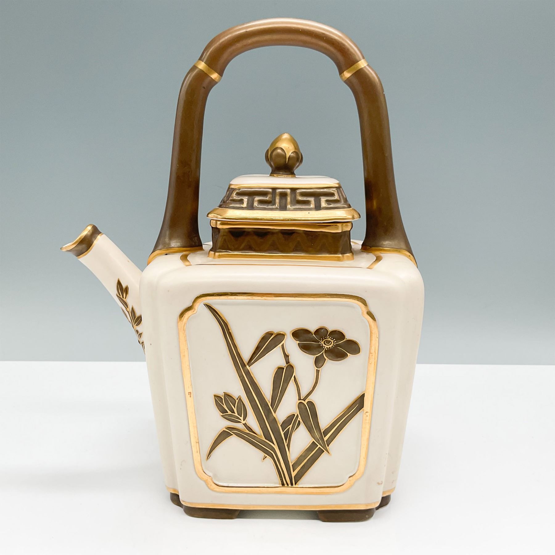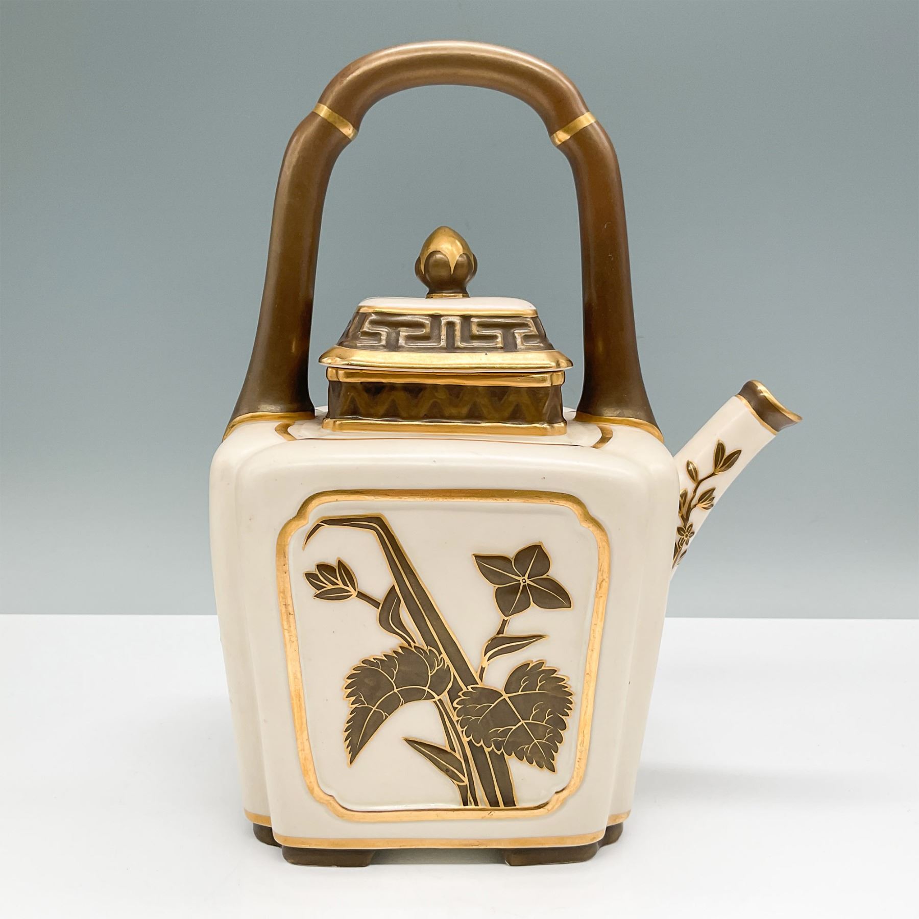 A Royal Worcester tea pot, circa 1900, standing 9.25"H. This elegant piece features intricate hand-painted botanical motifs and geometric designs in gold against a cream background. The unique squared design is complemented by a richly gilded handle and lid, adding a touch of luxury. The tea pot bears the Royal Worcester backstamp, confirming its authenticity. A fine example of late 19th to early 20th-century English craftsmanship, perfect for collectors or as a decorative statement.