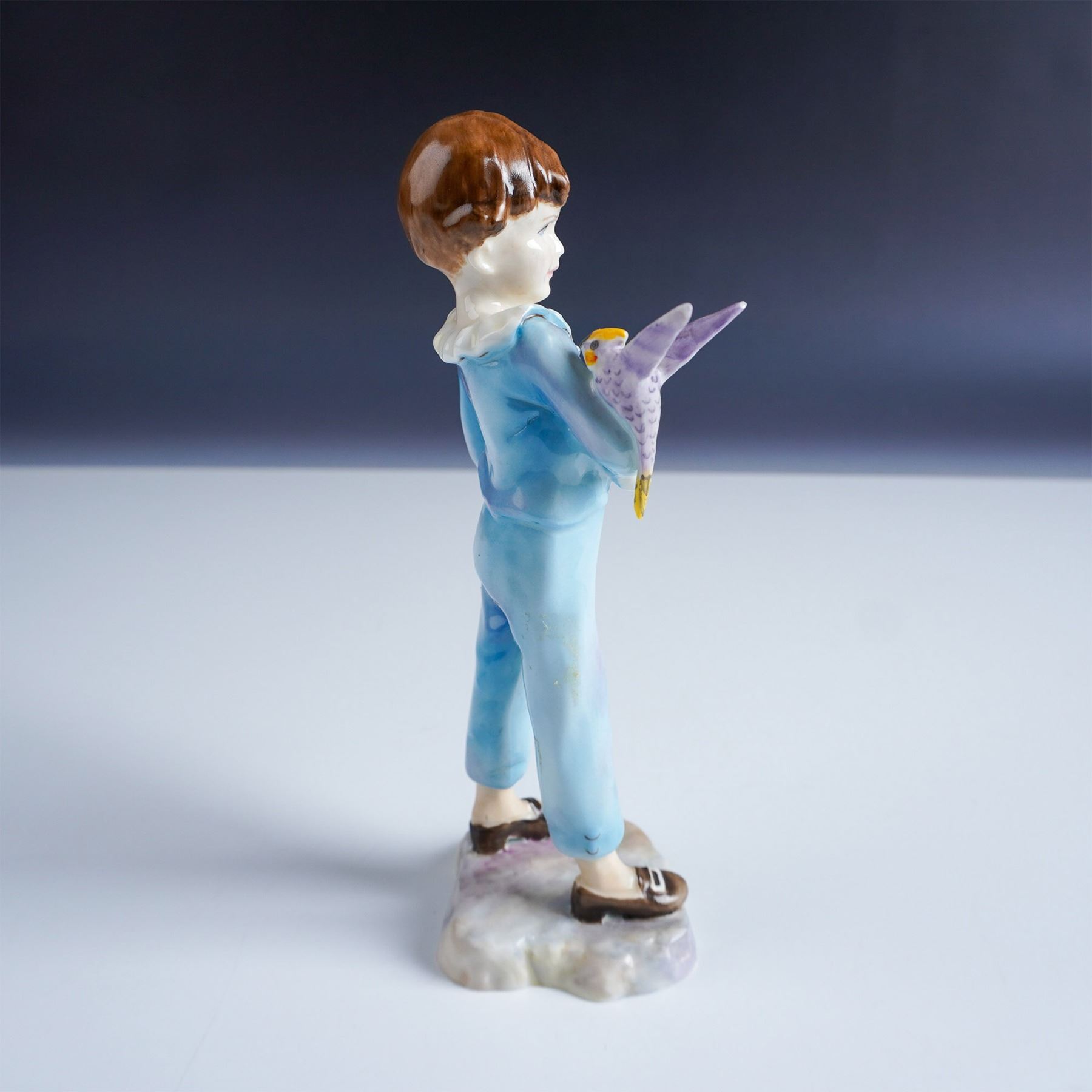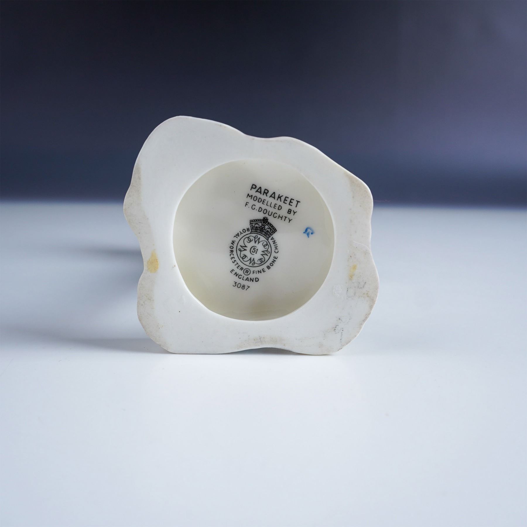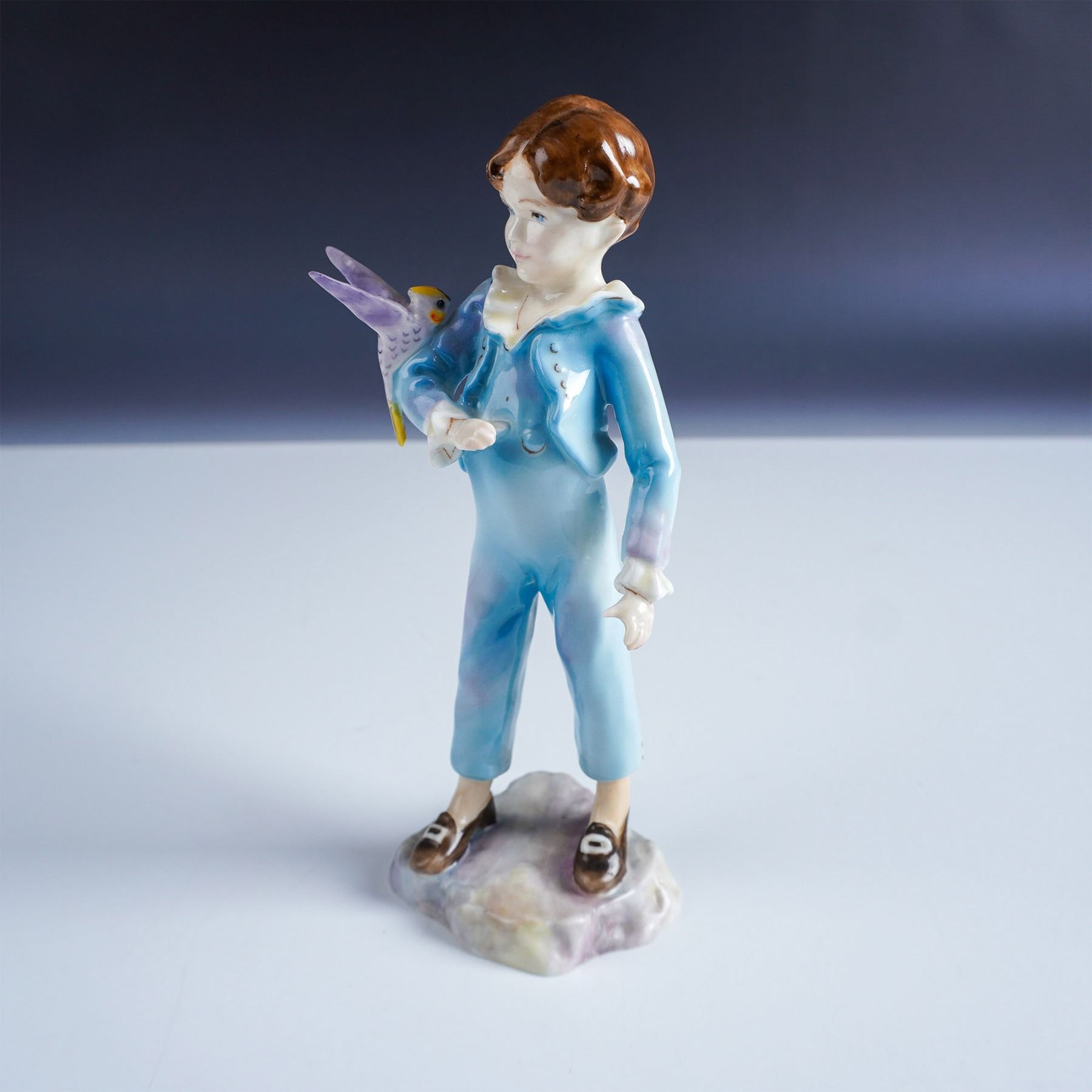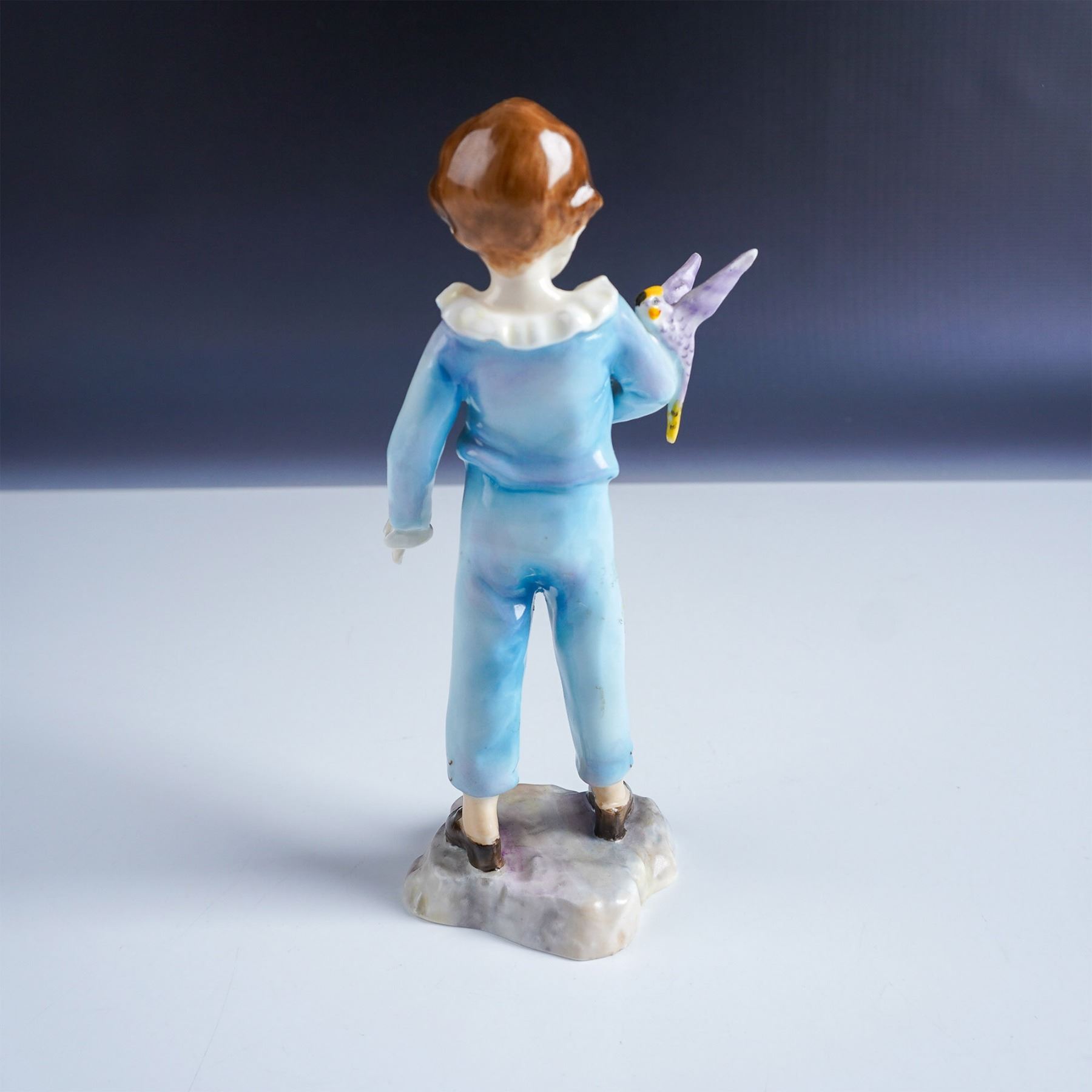 This charming Royal Worcester bone china figurine, titled Parakeet (3087), was modelled by the talented F.G. Doughty. The piece features a young boy dressed in a light blue outfit, gently holding a colorful parakeet perched on his arm. The figurine captures a sense of innocence and whimsy, with exquisite detailing and vibrant hand-painted colors. The base bears the Royal Worcester backstamp, confirming its authenticity.