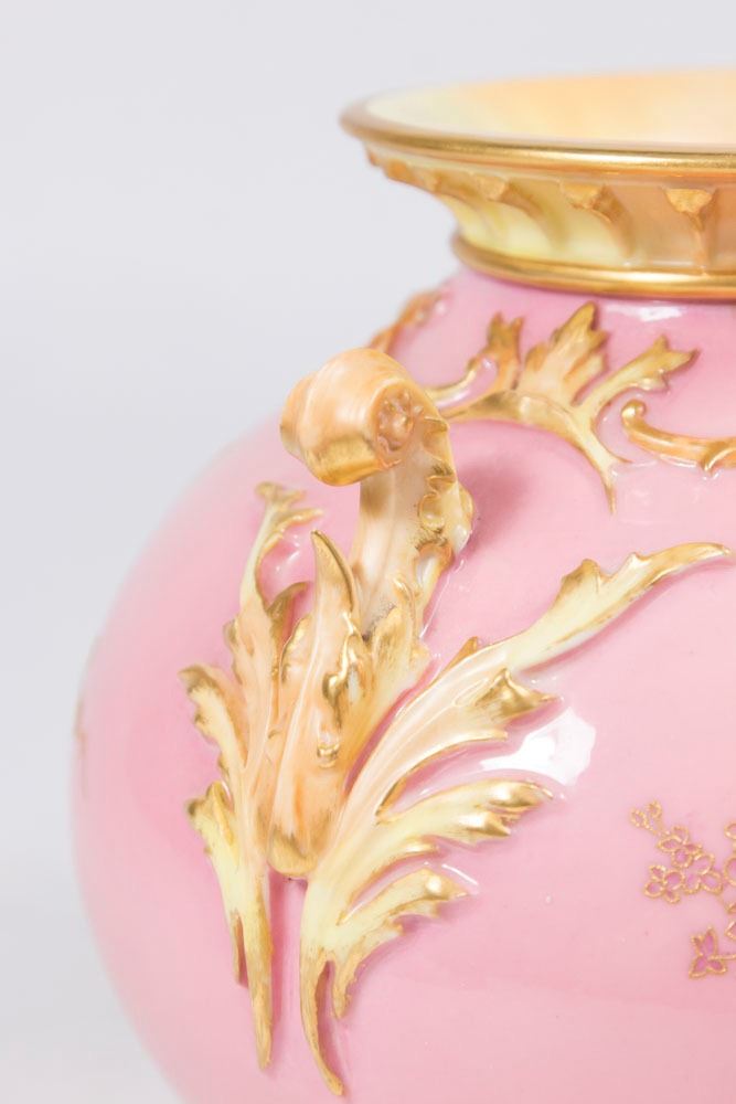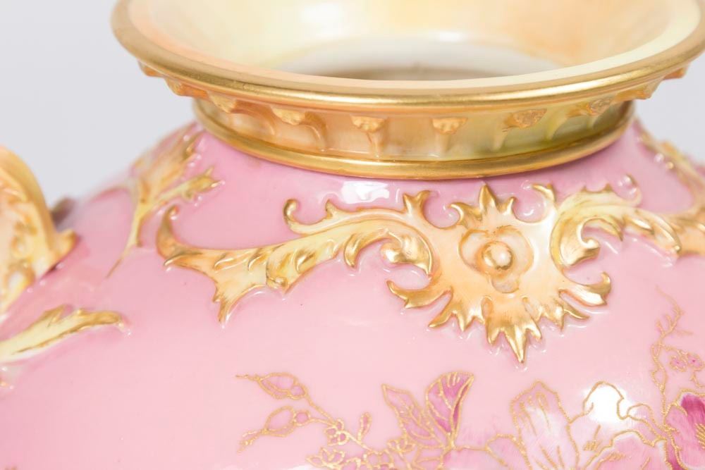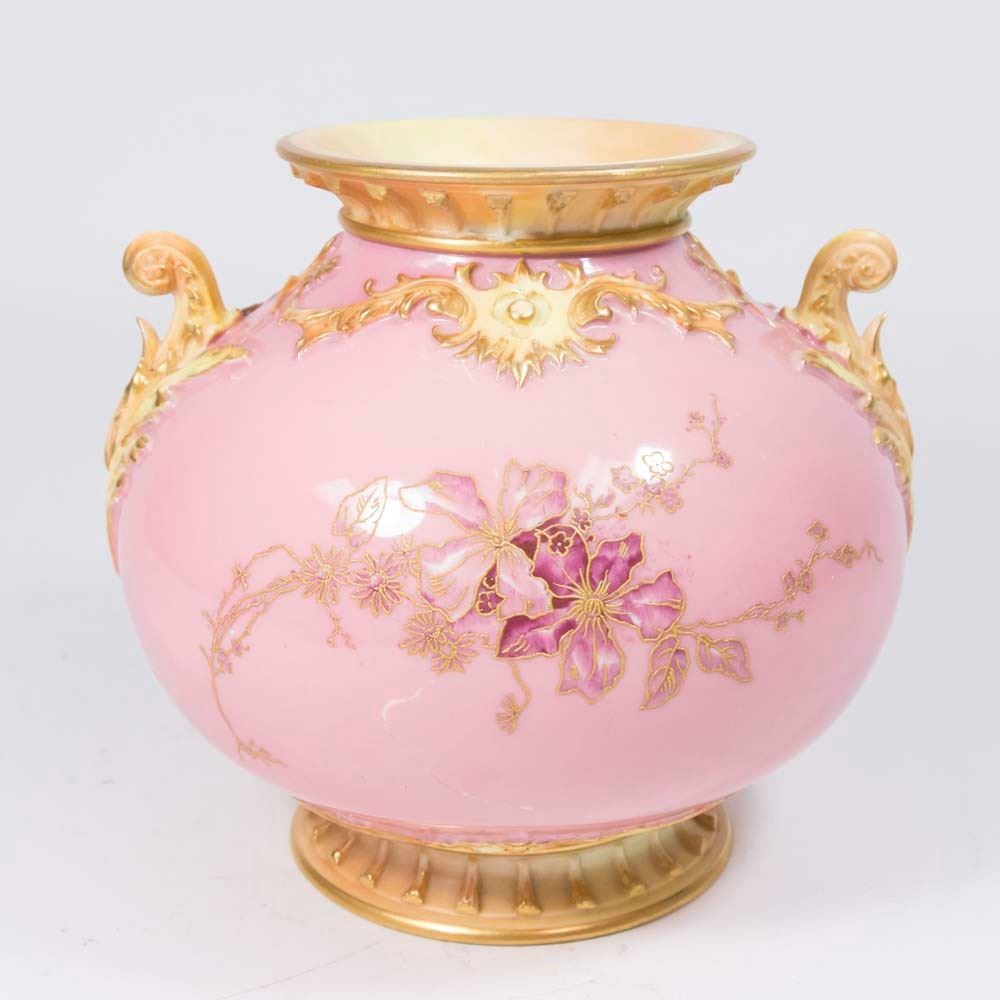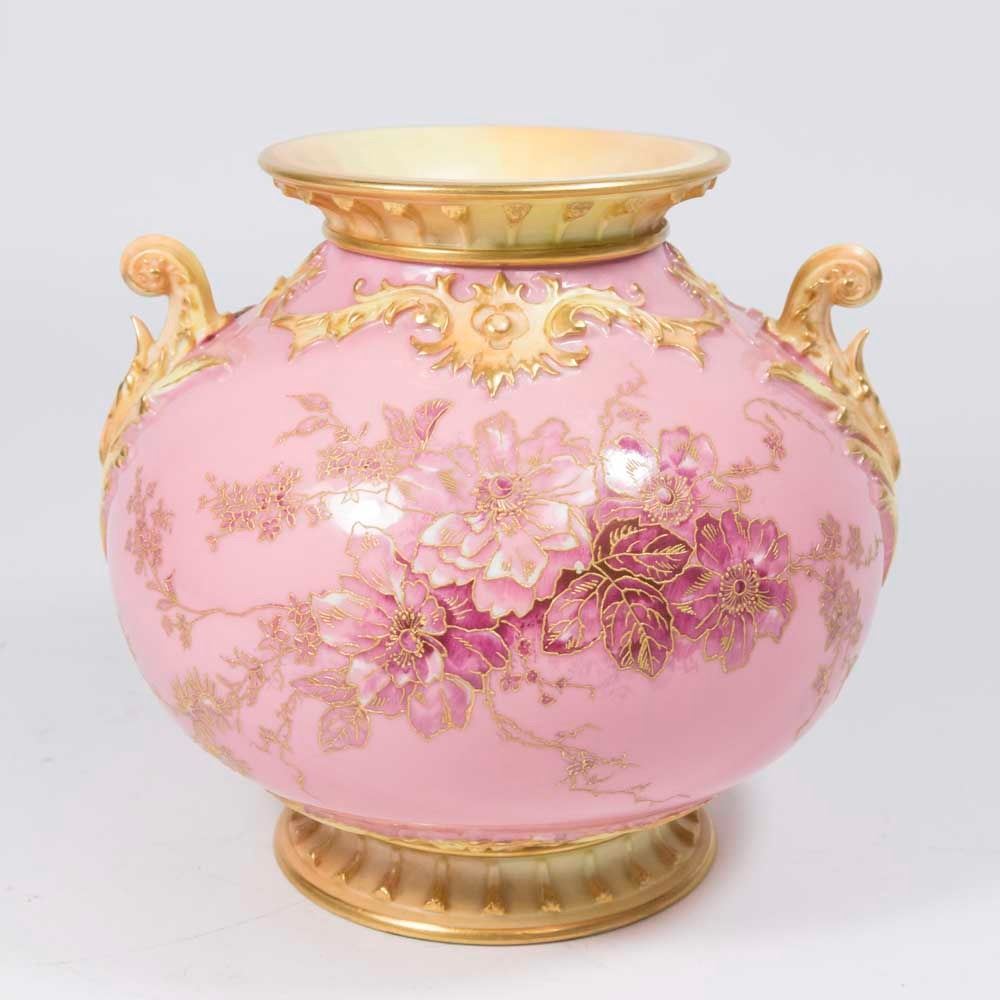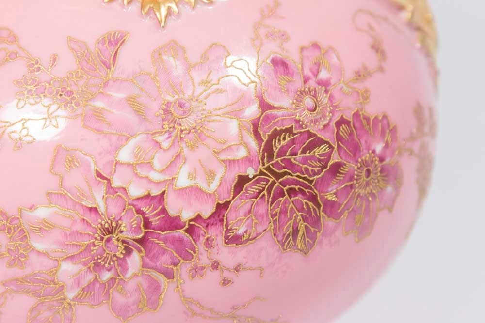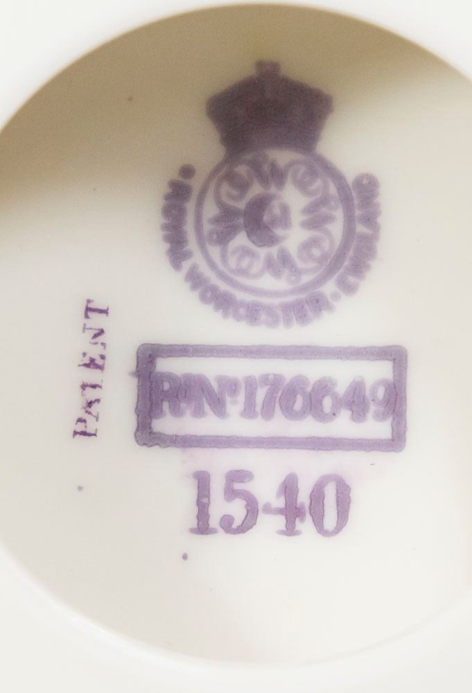Floral decoration. Purple stamp. RN# 176649. 1540. Approx. 8" H x 8" D. (6133) Discoloration on the top rim. Possible repair to the bottom. Crack to surface.