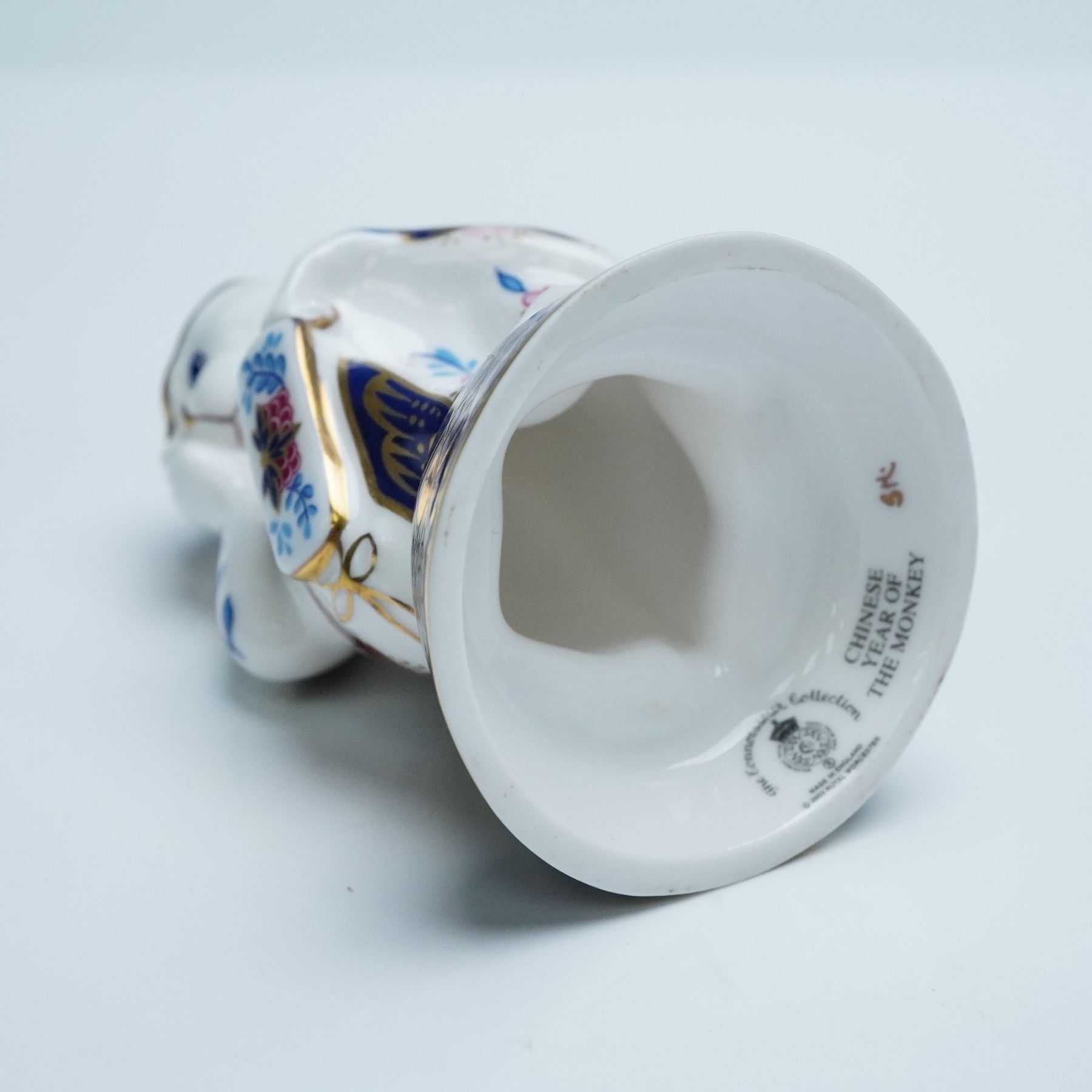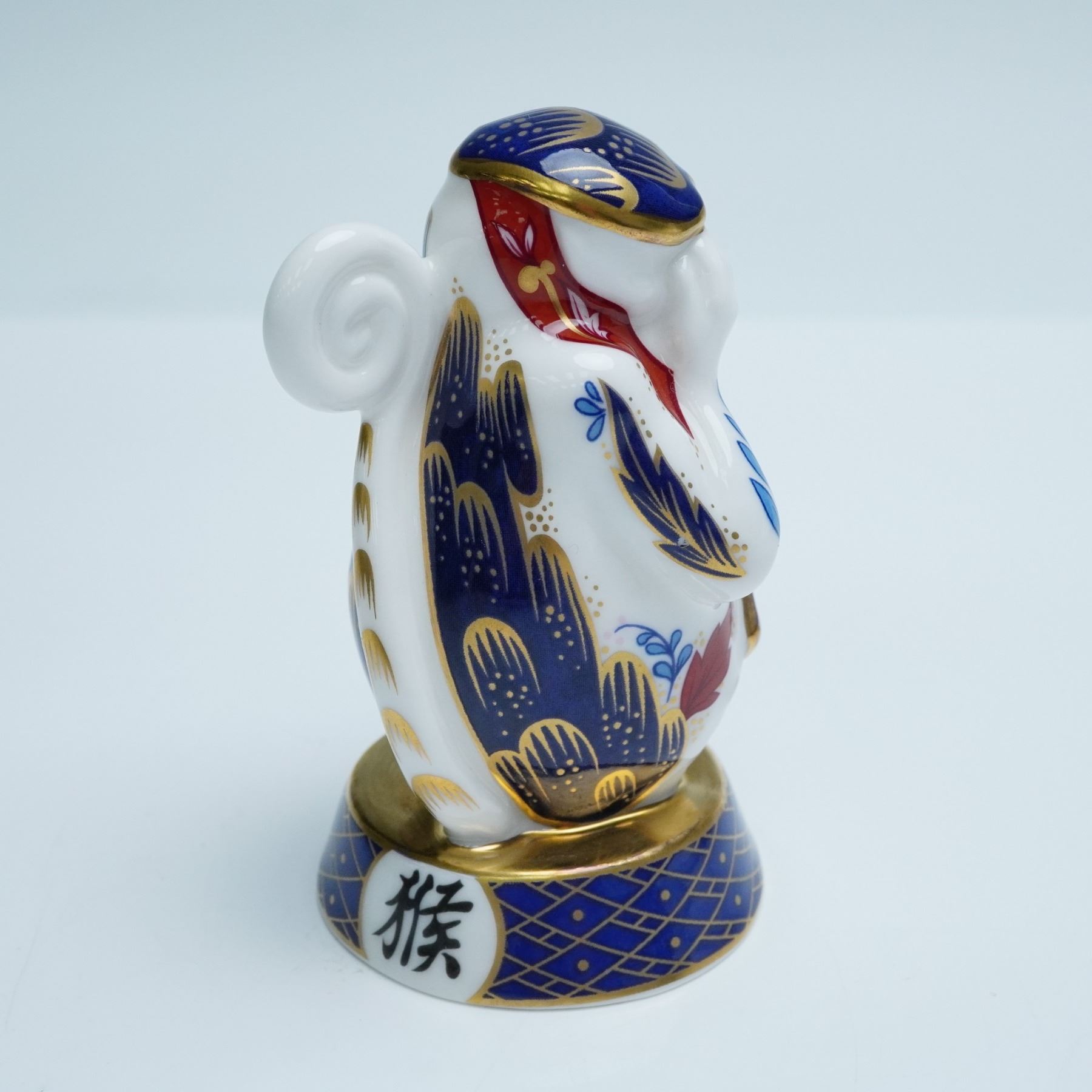 A finely crafted porcelain commemorating the Chinese Year of the Monkey, executed in the iconic Imari palette with intricate gilded accents. The stylized monkey is depicted in a contemplative seated posture, adorned with lavish floral and foliate motifs in red, cobalt, and gold, all rendered with the precision of hand applied work. The base features a deep blue geometric ground encircled by gilding. Royal Worcester backstamp.
