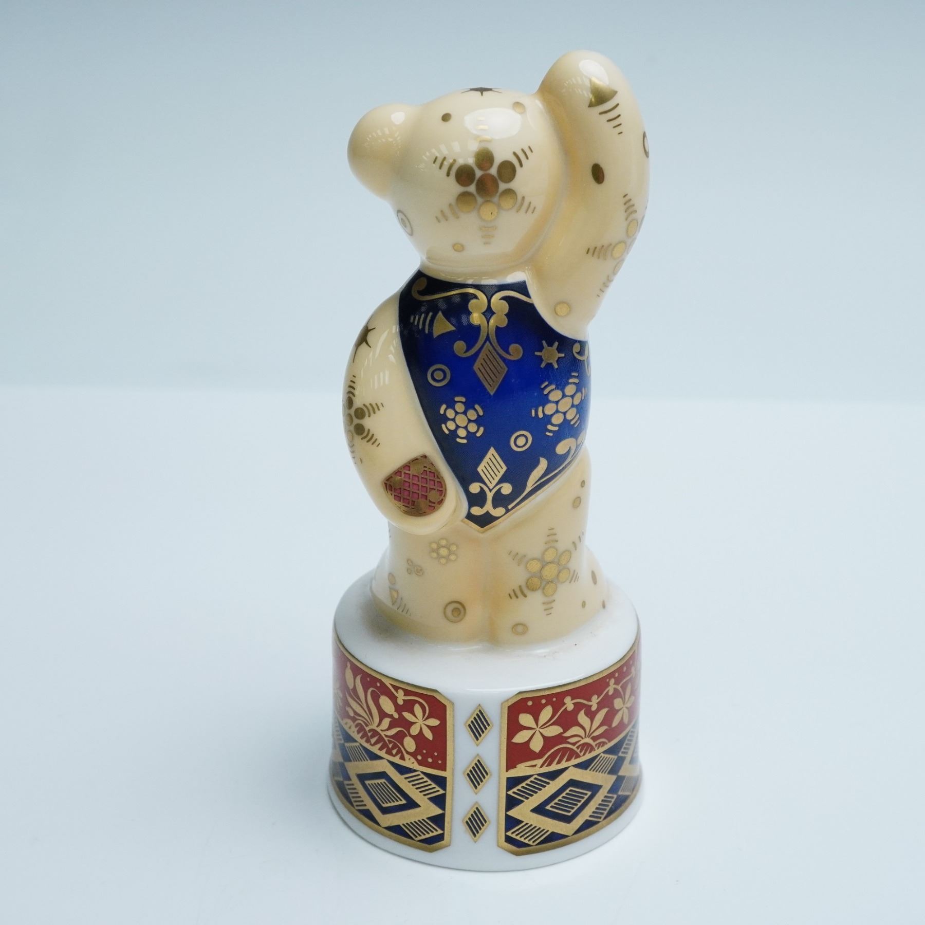 A richly decorated porcelain candle snuffer from The Connoisseur Collection. This celebratory figure features intricate geometric and floral designs throughout. The bear stands with one hand above its head, atop a round base. Royal Worcester backstamp.