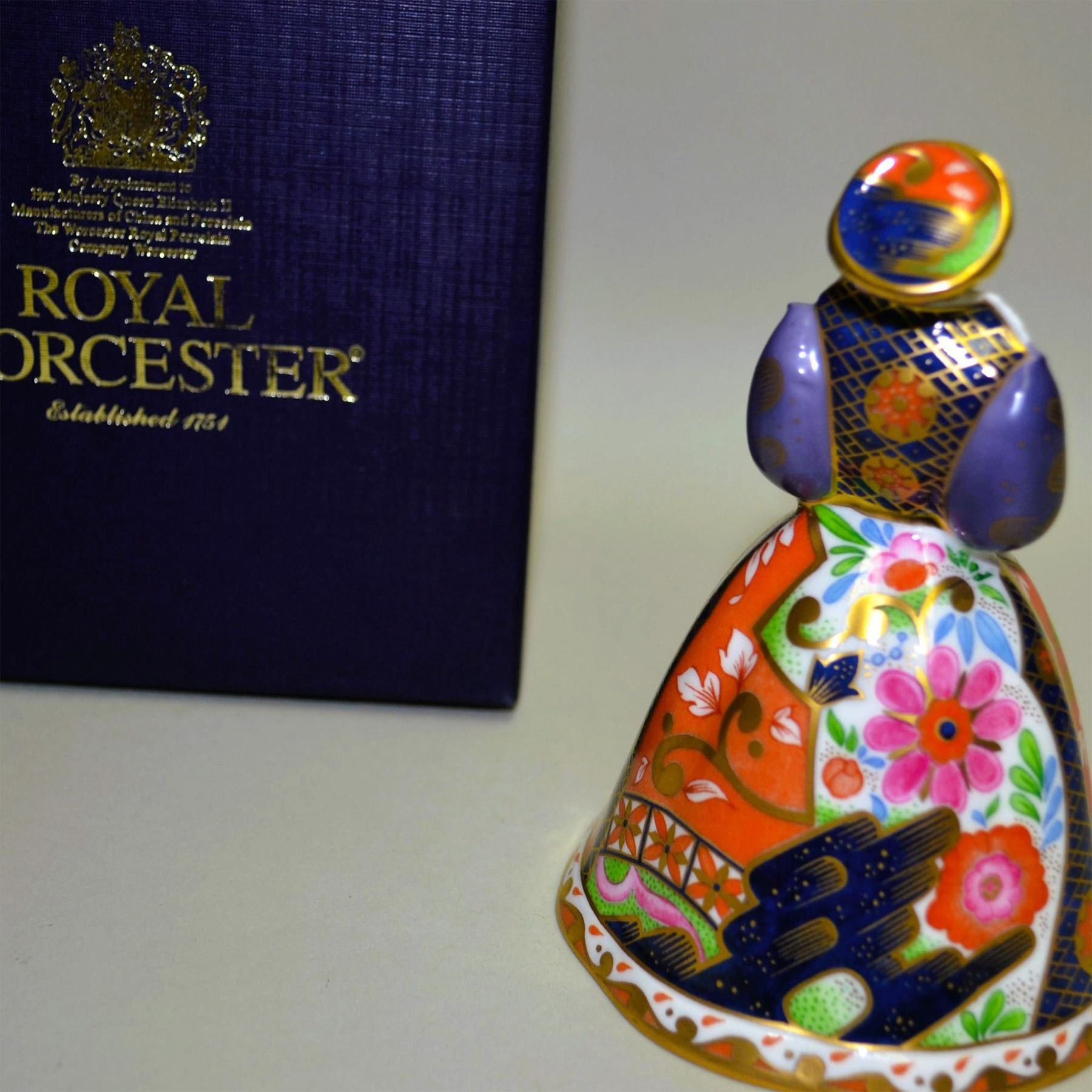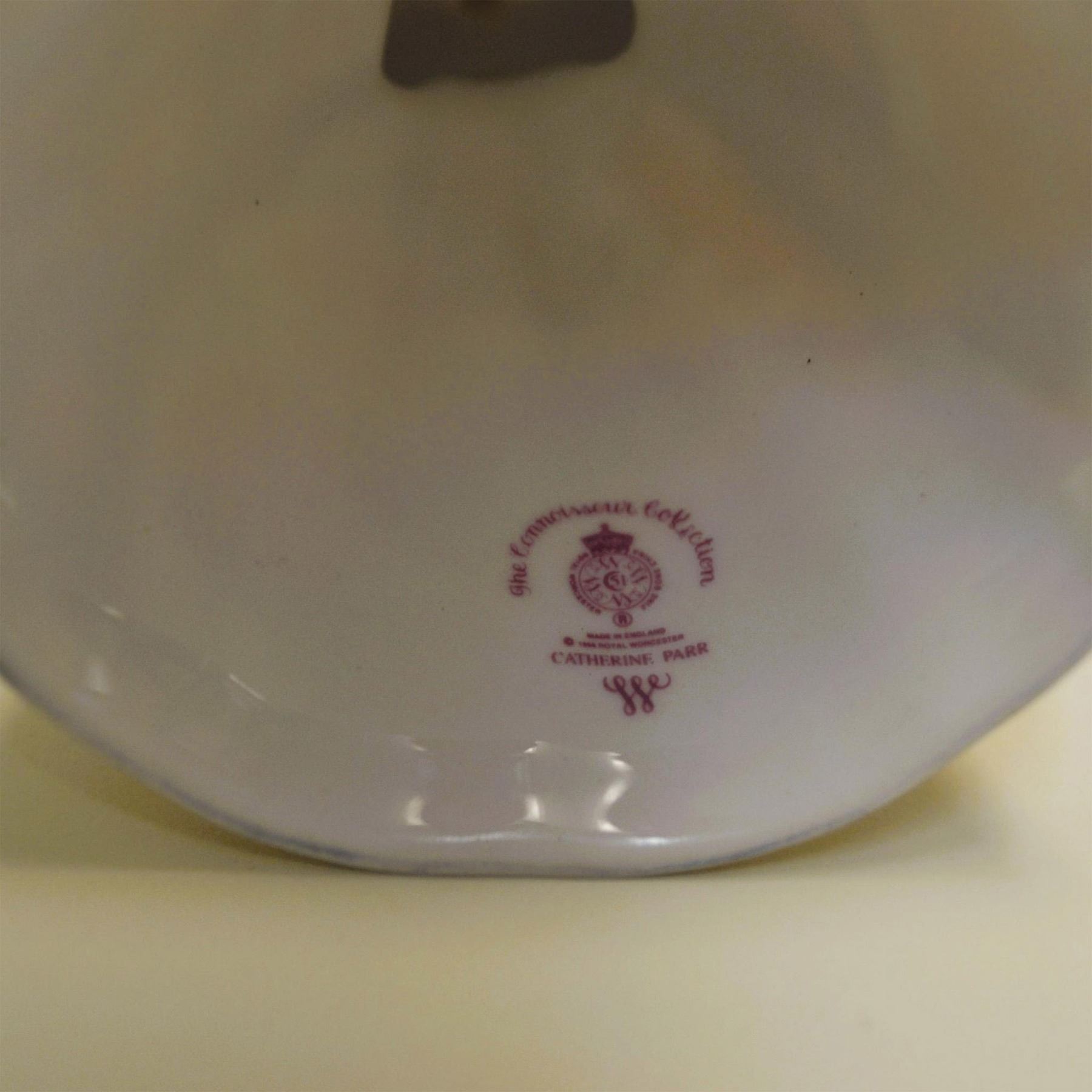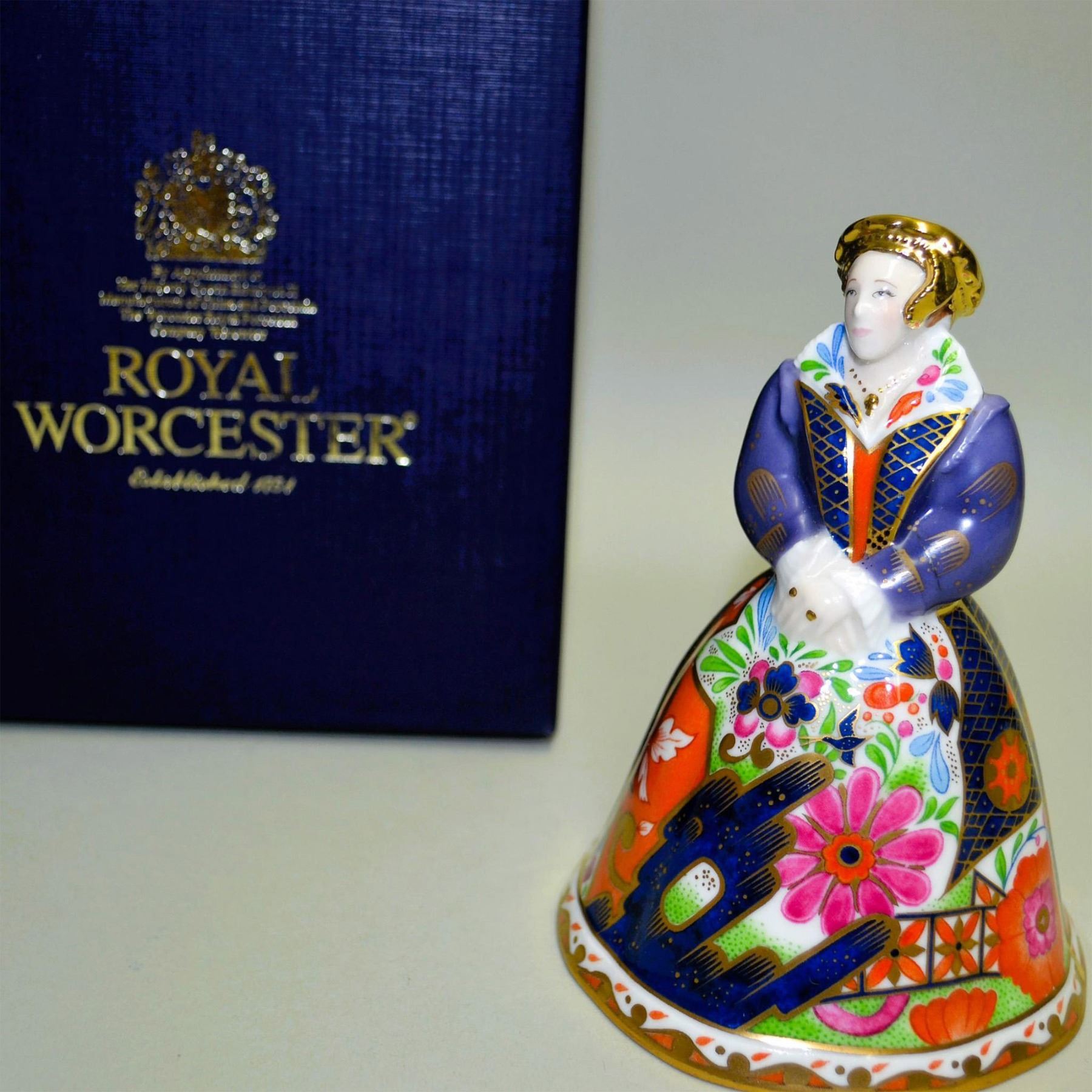 English Fine Bone China, Glazed Decorated. Hand painted, hand created, by the Artists of the Royal Worcester Studio, featuring The Catherine Parr Candle Snuffer. Colorfully Decorated, in her long evening floral dress, front and back, with gold accents on the pattern of the dress. A Vintage, sold out edition, Issued in 2000, from The Connoisseur Collection. Authentic Royal Worcester Backstamp inside the interior of the base of the Candle Snuffer. See photos for further details. Mint condition, never displayed. Size: 3.5"L x 3.5"W x 5"H. Original Box. Like new. From the Archival Collection of Re Vann Galleries, G.Reasoner, Owner.