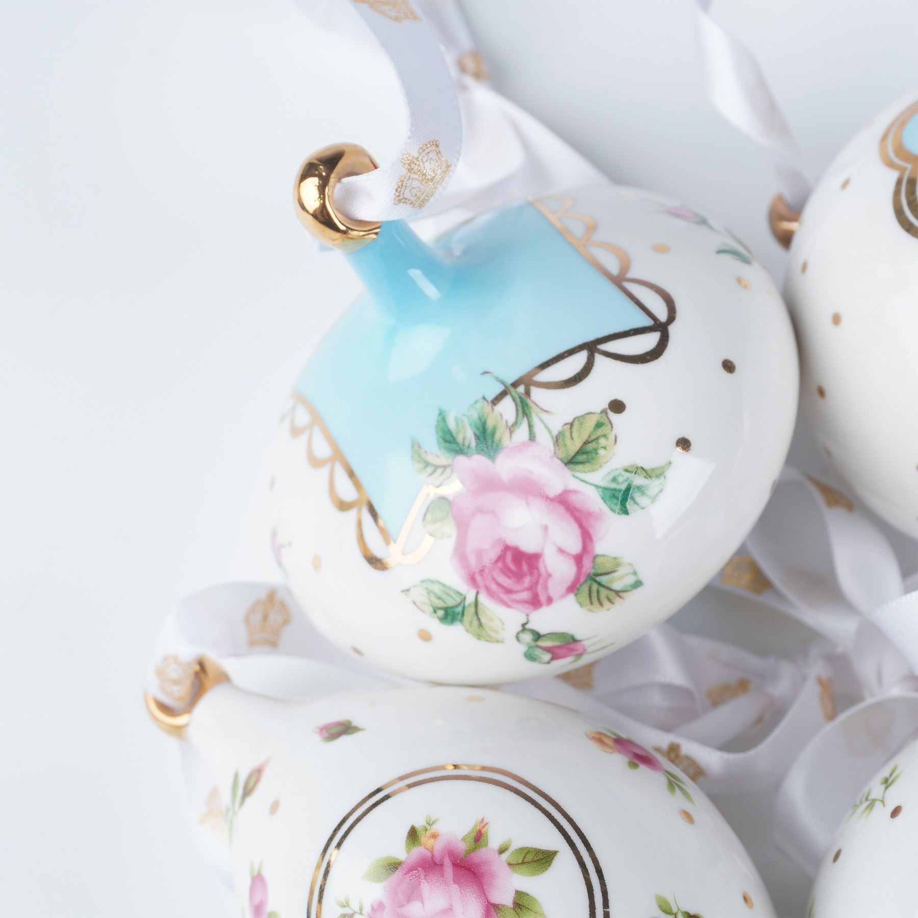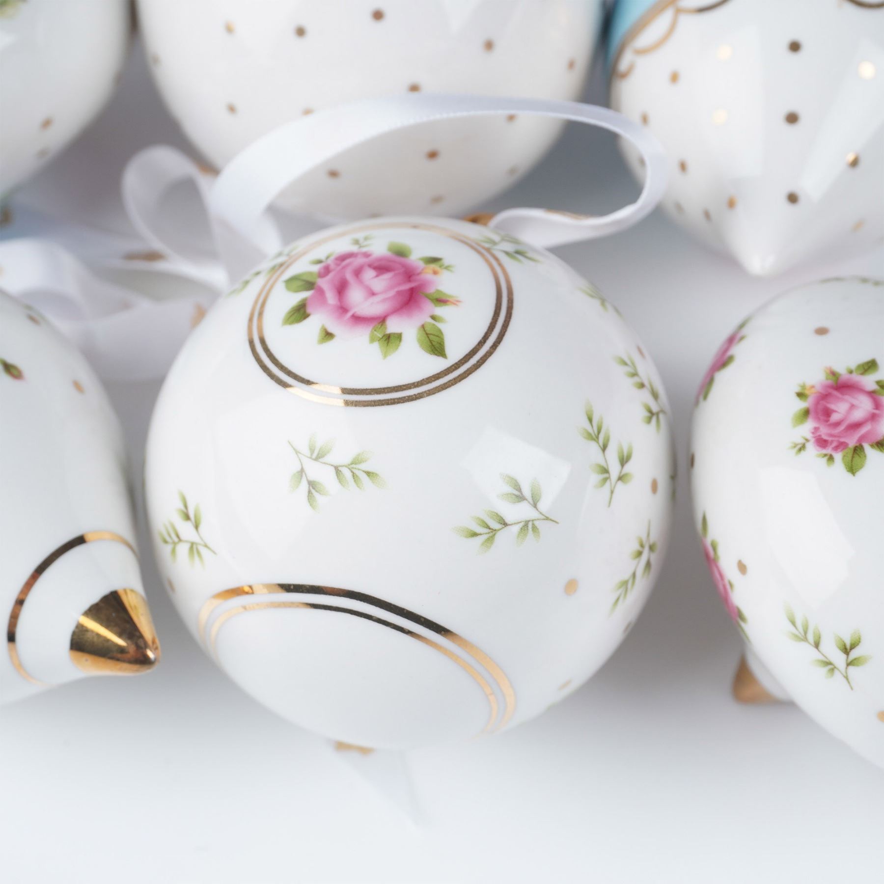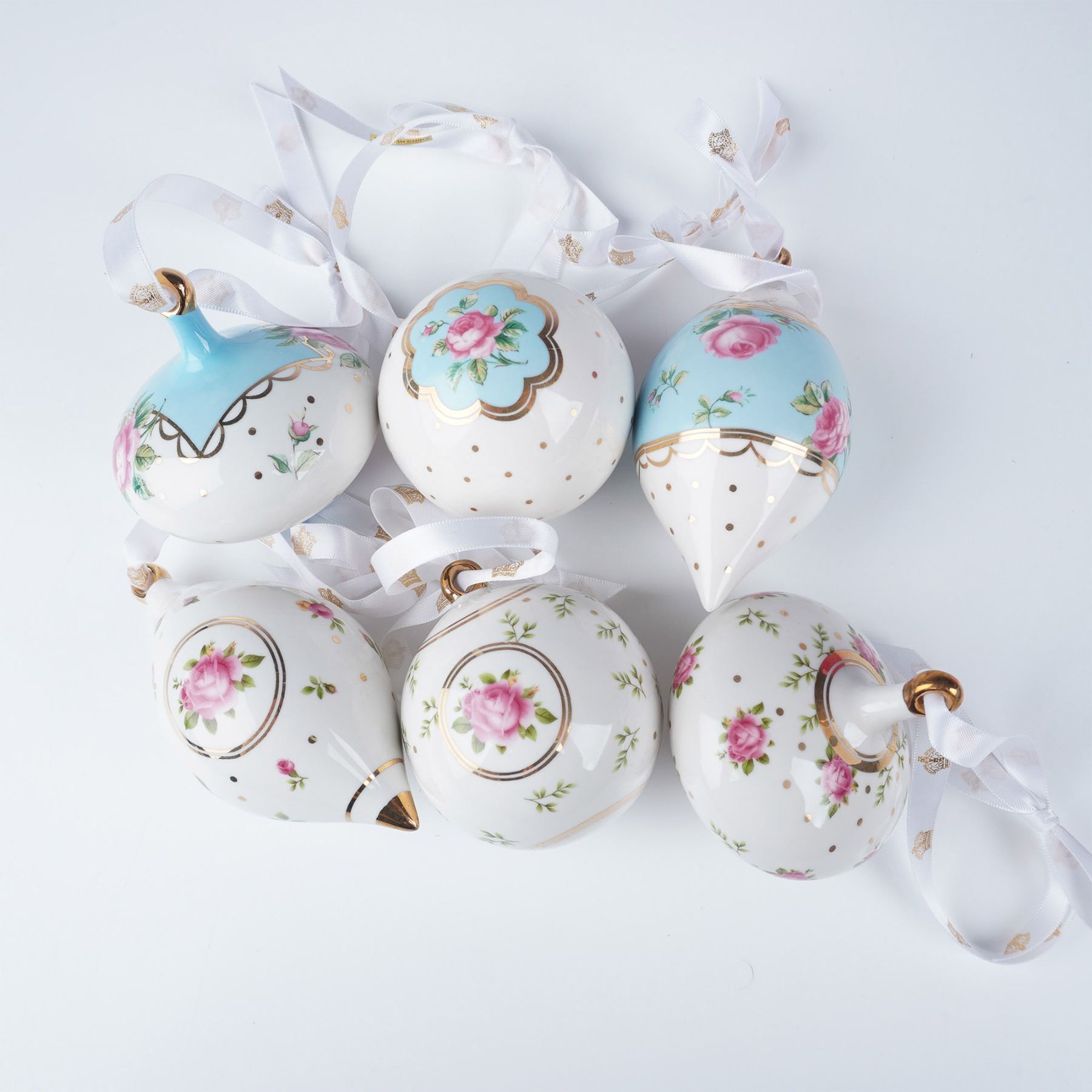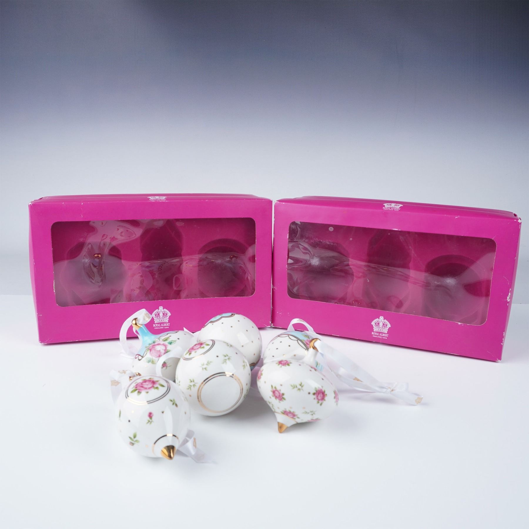 Set of six Royal Albert porcelain ornaments, each beautifully decorated with floral motifs, gold accents, and intricate detailing. Featuring the brands signature pink rose design, some ornaments also incorporate soft blue highlights and delicate gold trim. Each piece is fitted with a white ribbon adorned with a gold-printed Royal Albert emblem, perfect for display. Comes in original pink packaging, showing some signs of wear. Largest ornament: 4.25"H.