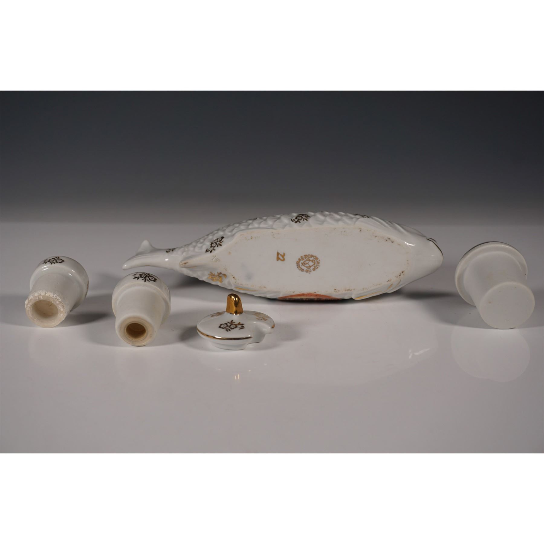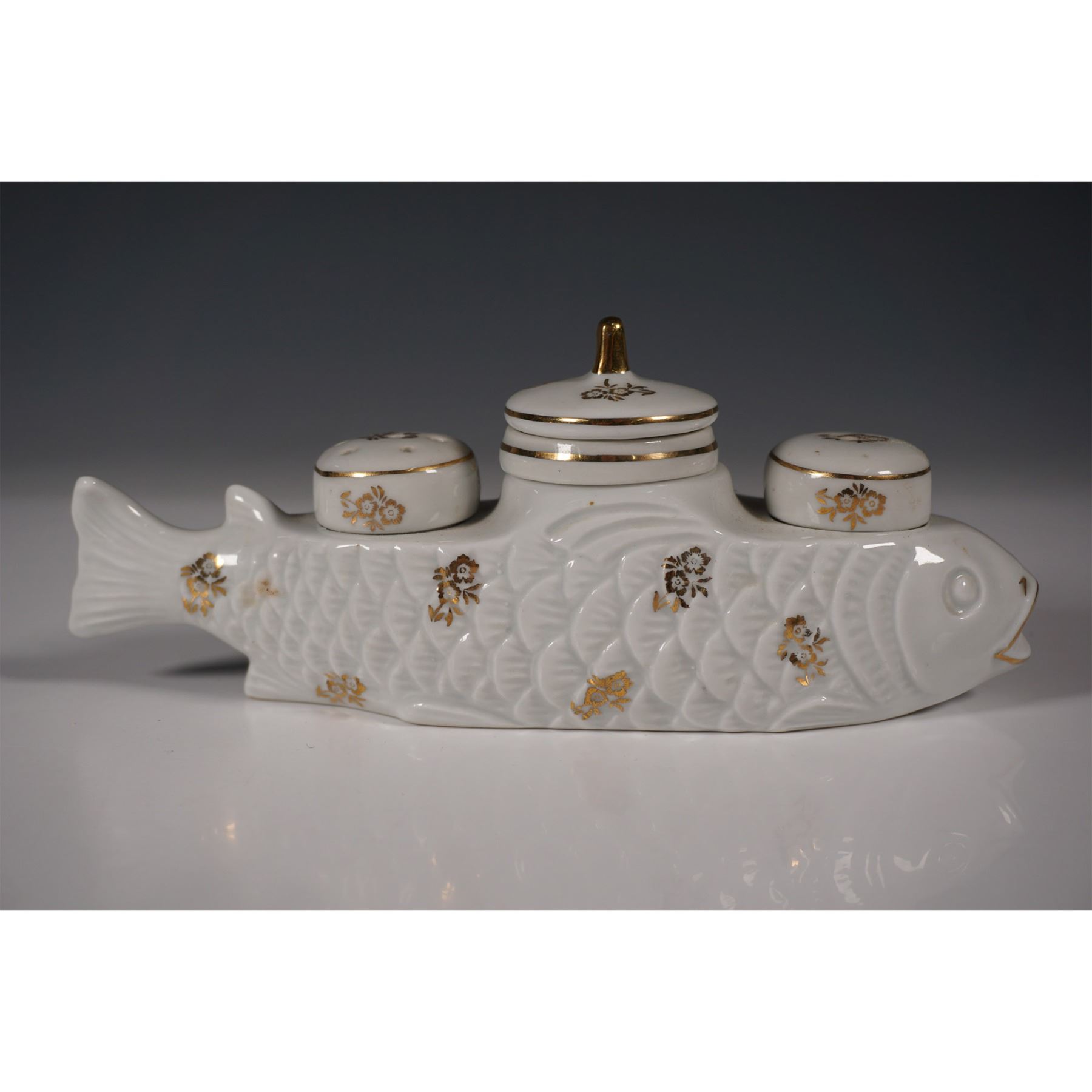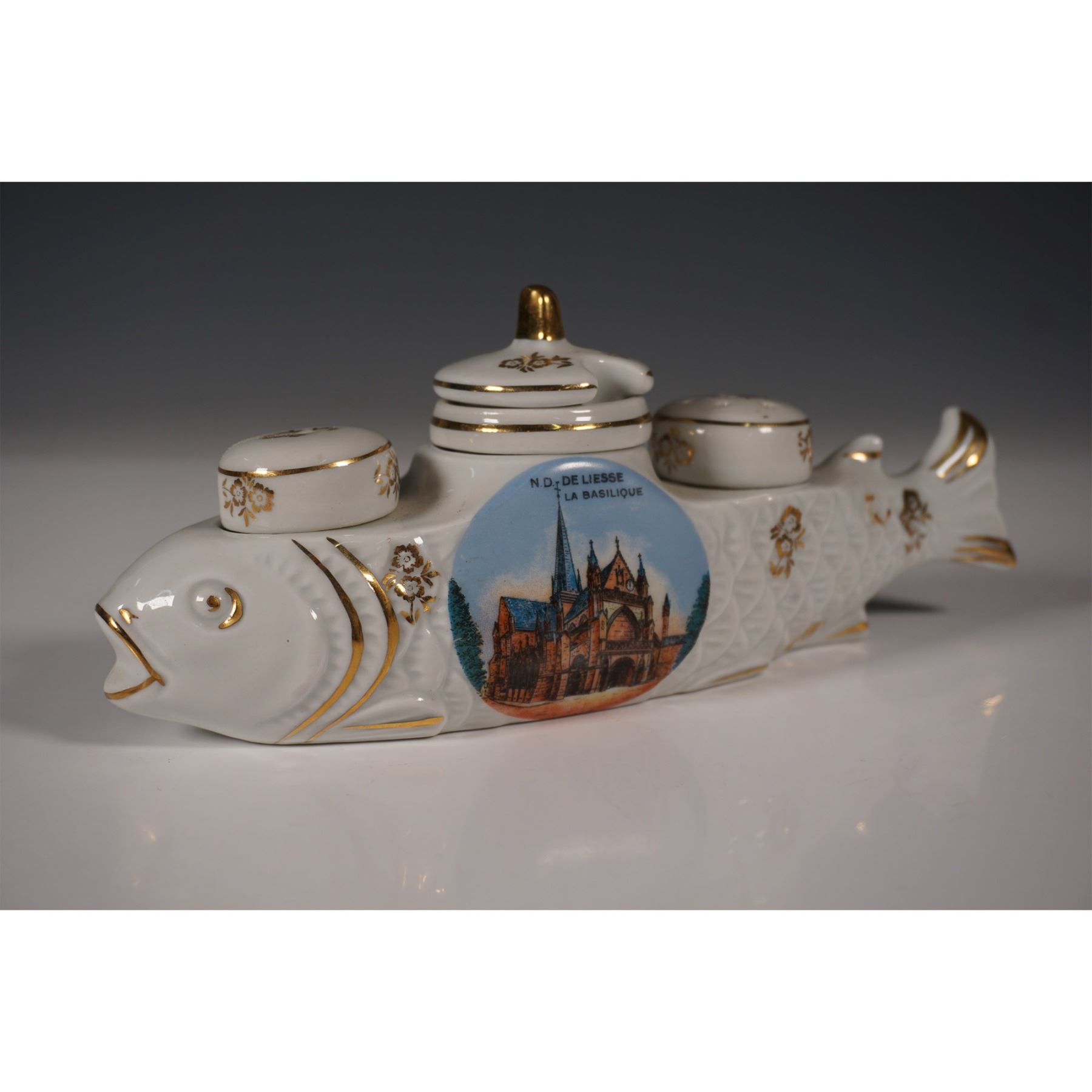This lot features two elegant antique porcelain condiment sets, including a Royal Worcester tabletop set and a Porcelaine de France fish-shaped set, both adorned with gold accents. The Royal Worcester set, marked with registry number Rd No 145176, Pattern 1433, includes a salt and pepper shaker, a mustard pot with lid, and a handled tray, exemplifying English craftsmanship from the late 19th to early 20th century. The Porcelaine de France set, shaped like a fish, includes a mustard pot, salt and pepper shakers, and an integrated tray, decorated with hand-painted floral motifs and a gilded scenic depiction of Notre-Dame de Liesse Basilica. Both sets are in excellent antique condition with minor wear, making them desirable collectibles for fine porcelain and vintage kitchenware enthusiasts.