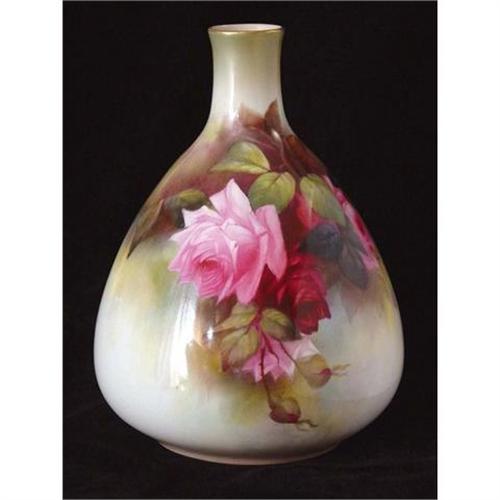 Royal Worcester porcelain vase decorated with roses, fine gold rim around top and bottom borders and blush ivory color interior. It is signed R. Austin, which stands for Reginald Austin (1890-1955), an English School watercolor painter born in Worcester. The vase is marked on the underside with numbers 2431 and 15.54. The year of manufacture is determined by the number of dots surrounding the words "Royal Worcester England." Royal Worcester pieces were dated in this way after 1891 and each dot represents an additional year. This vase has 21 dots so it must have been made in 1912 (1891 + 21 = 1912). In very good used condition as shown. Please ask questions, request additional photos and shipping costs before buying.