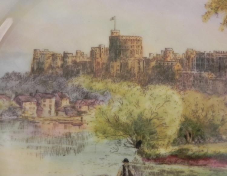 This plate provides a pleasant view of Windsor Castle with a boat on the river, and one of the Queens homes in the background. The plate is from Royal Worcester, a company that closed their factory in 2009. The back side has a hallmark, inspector sticker, and incised number 20. It is fine bone china with nice transfer image, and gold rim, measuring 11 inches in diameter. Its condition is excellent. * * This is a pretty plate for anyon who loves the Royals and their history.