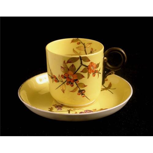 Beautiful Royal Worcester yellow cup and saucer decorated with hand-painted flowers with a Japanese style inspiration. It is marked on the underside with the Royal Worcester mark in puce and the letter "U" underneath which dates it to 1883. In good used condition as shown, with wear to gilt and hairline. Please ask questions, request additional photos and shipping costs before buying.
