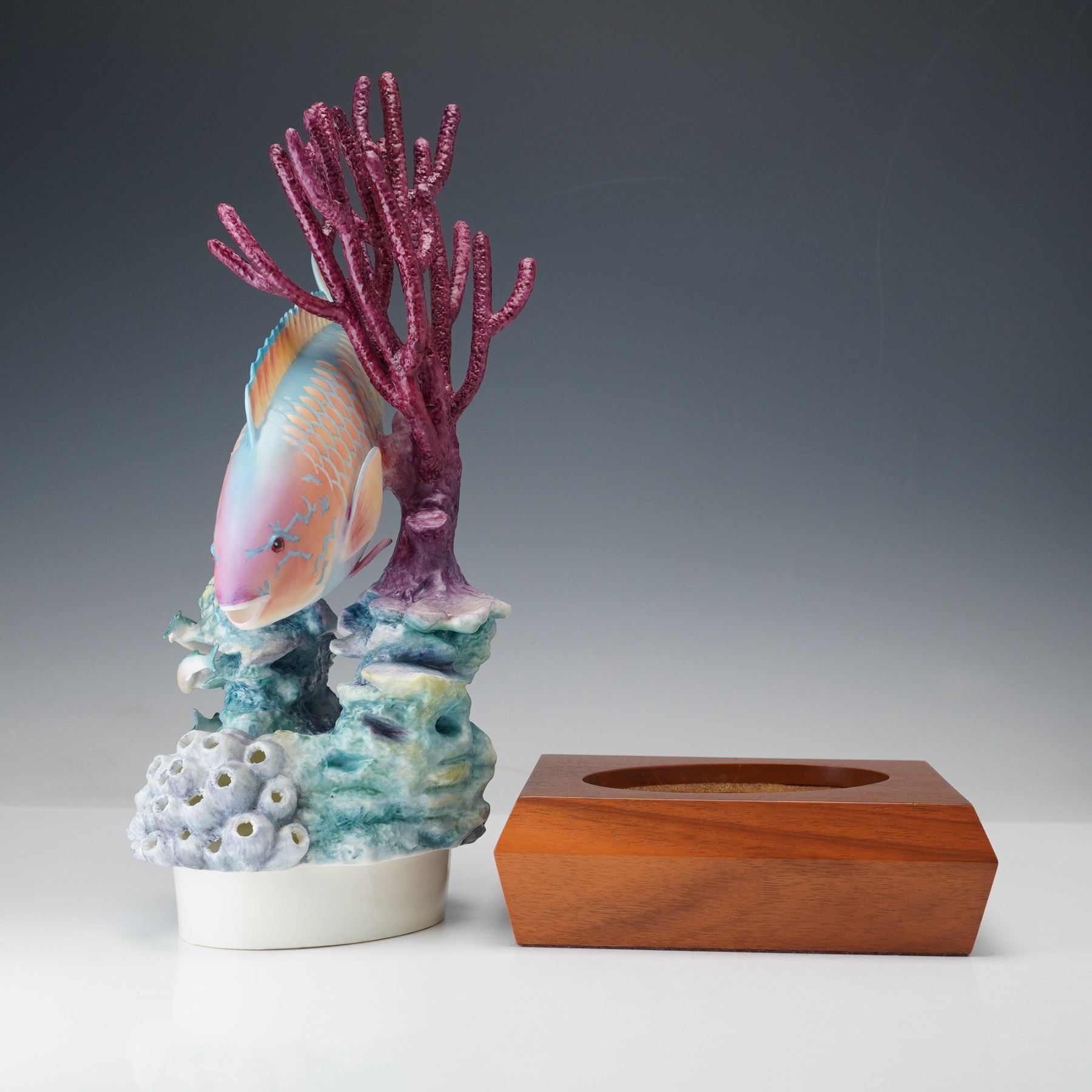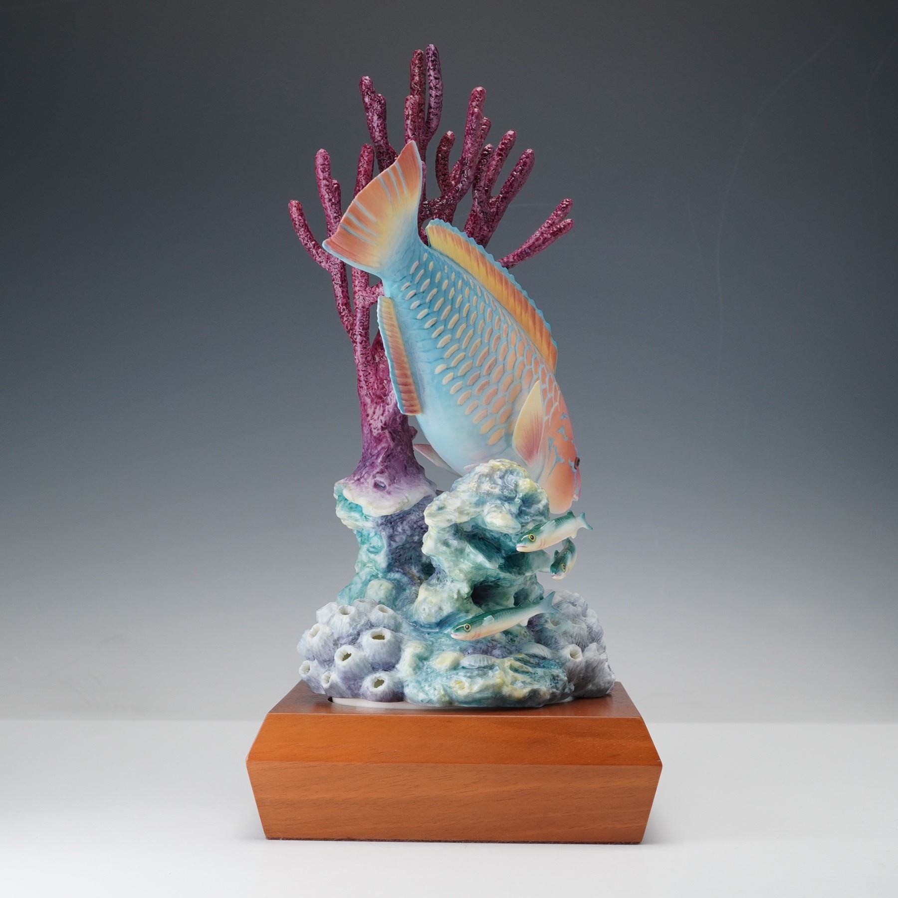 A charming tropical fish with hand painted finish. Features the bright colored fish against purple coral and finished on a wooden base. Designed in a numbered edition; this is edition no. 124. Ronald van Ruyckevelt marked to the base. Royal Worcester backstamp. This item has a base included.