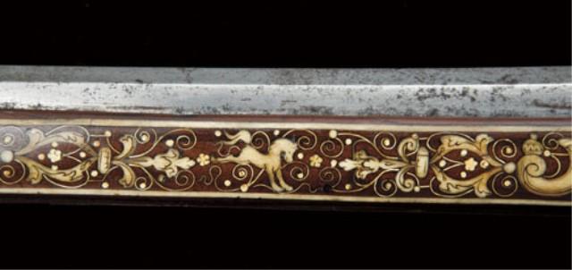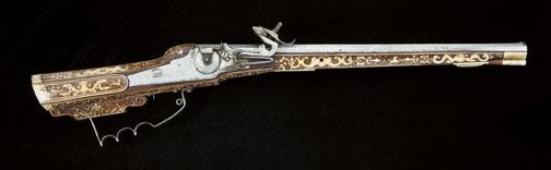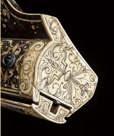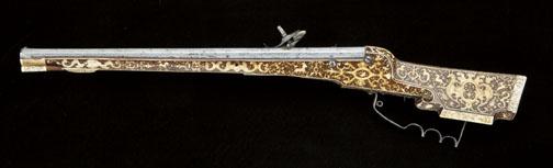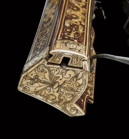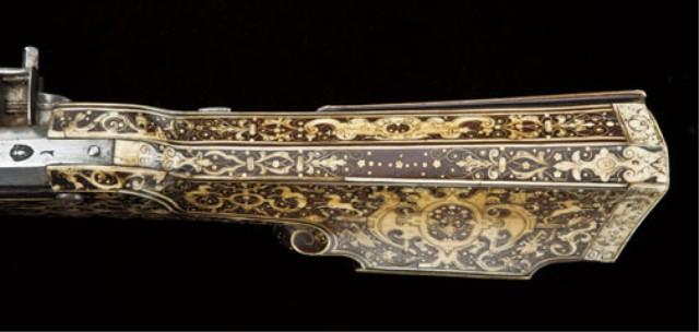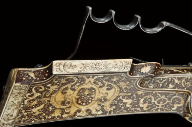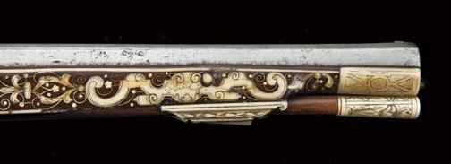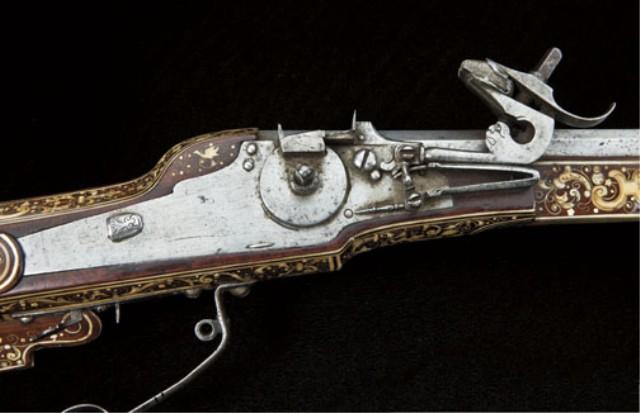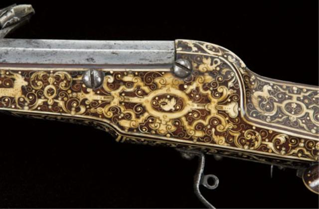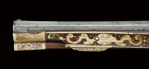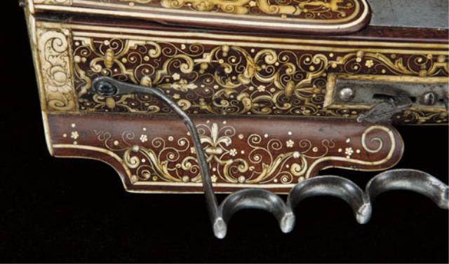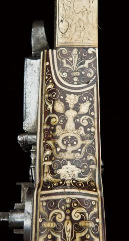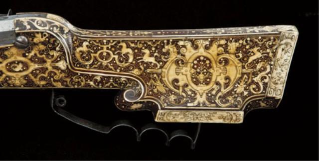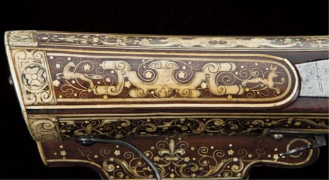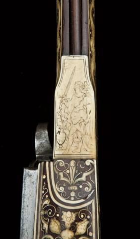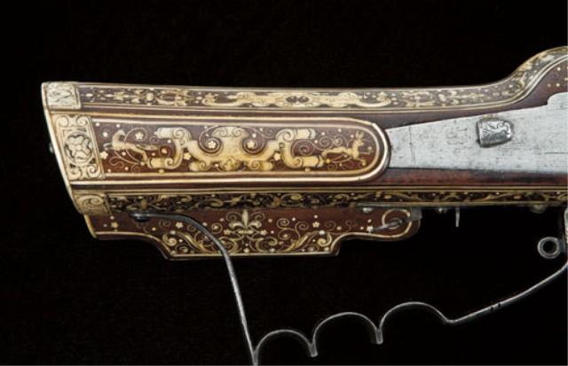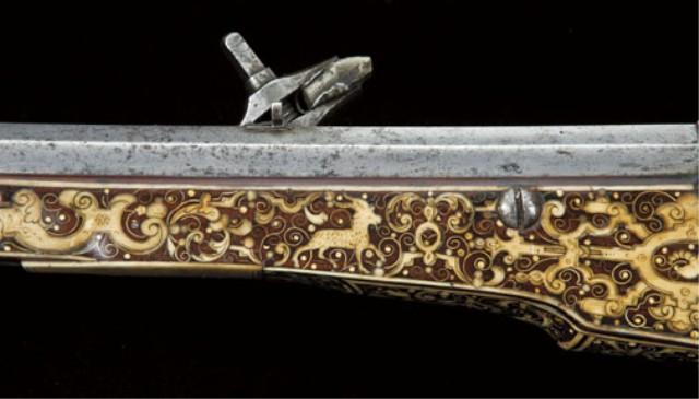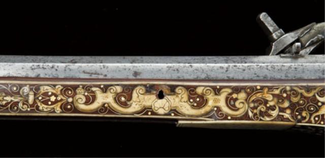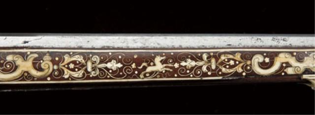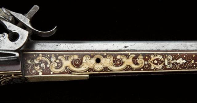 Royal quality wheelock carbine of diminutive size showing finely inlaid stock, with maker’s hallmark barrel showing the initials “C.G.” with the figure of what appears to be a lobster with a man’s head stamped at breech. The carbine measures 25-3/4” overall with 17-5/8” barrel of approx. .45 caliber rifled. The gun shows extremely high quality inlay with figures of winged nudes, grotesque faces, tight scrolls, with saxon type dots and flowers, mythical beasts, stags, scrolls, snails, demons, figure of lady justice holding a sword, and typical 17th century motifs. The inlay was accomplished by a master, probably at a royal workshop. The inlay is 98% intact with a couple of small losses and a couple small areas of very minor restorations that are almost imperceptible. The stock is in near fine untouched original condition. The metal surfaces are uncleaned. The lock is well made and retains its original parts and is complete. The cock or hammer shows a whimsical man’s head and there is also a face engraved on the safety. Otherwise, the metal is plain as not to clash with the intricate inlays in the stock. The metal surfaces show some slight erosion, pinprick pitting, normal aging, but have
