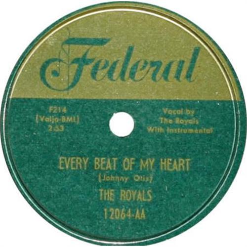 <B>The Royals 78 Group of 2 (Federal, 1952).</B></I> The group that evolved into the Midnighters after Hank Ballard joined in 1953 released five singles in 1952, all much sought-after by collectors. Here are two of them in ridiculously high grades! Included are "Every Beat Of My Heart"/ "All Night Long" (Federal 12064, 1952) in MT 9 and "Moonrise"/ "Fifth Street Blues" (Federal 12088, 1952) in GM-MT 10. <I>From the GRT Collection.</B></I> <I>From the GRT Collection</B></I>.<BR><BR><b>Shipping:</b> Recordings (<a target="_blank" href="http://www.heritageauctions.com/common/shipping.php">view shipping information</a>)
