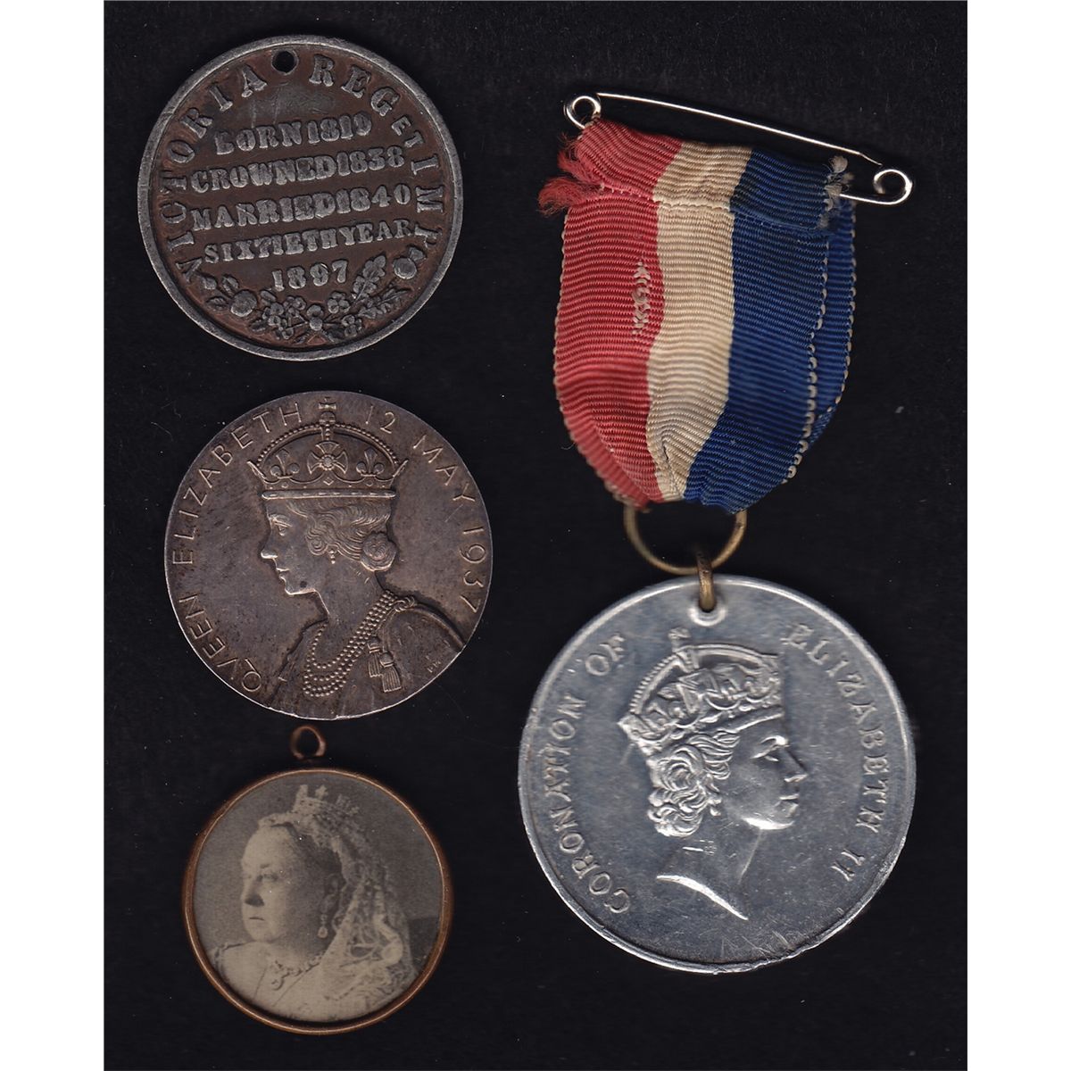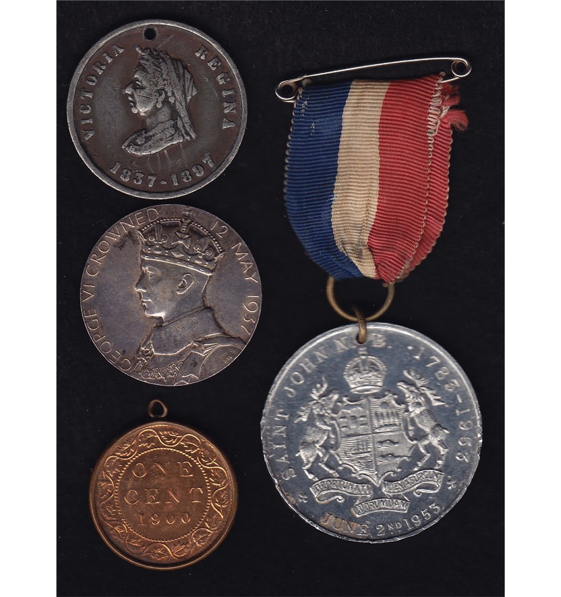 Royalty - George VI Coronation official medal, Spinks 388.1, 422 struck, silver, 15.5 gms, 1897 60th year commemorative Queen Victoria, WM, 1953 Saint John Queen Elizabeth Commemorative, AL, ribbon. 1900 cent with loop with the obverse of a photo of Queen Victoria. 4 Pcs.