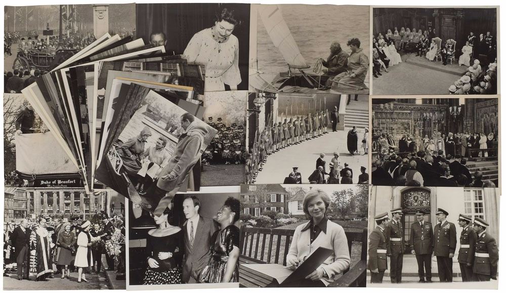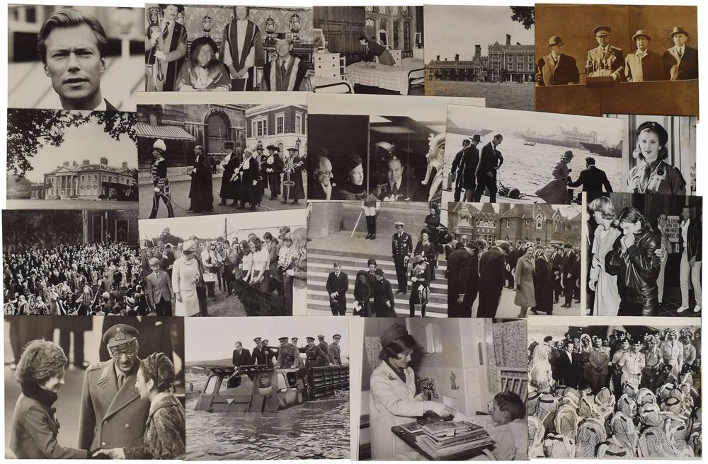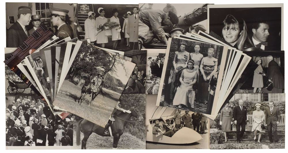 Collection of over 80 glossy and satin-finish photos, printed for press usage in the 1980s, ranging in size from 5.5 x 7.25 to 8 x 12, each photo depicting one or more members of a royal family, with subjects including: Elizabeth II (25; with many also picturing her husband, Prince Philip); Anne, Princess Royal (4); Prince Andrew, Duke of York; Prince Charles; Sarah, Duchess of York; Princess Margaret (4); Antony Armstrong-Jones, 1st Earl of Snowdon; Prince Philip, Duke of Edinburgh; Caroline, Princess of Hanover; Princess Stéphanie of Monaco (7); Albert II, Prince of Monaco; Archduchess Marie Astrid of Austria; Prince and Princess Michael of Kent; Hussein of Jordan (8); Queen Noor of Jordan; Princess Muna al-Hussein; King Birendra and Queen Aishwarya; King Bhumibol and Queen Sirikit; Abdullah Al-Salim Al-Sabah; Dina bint Abdul-Hamid; Moshoeshoe II of Lesotho; Selangor Sultanate; Faisal of Saudi Arabia; Prince Bandar Bin Faisal; Saud of Saudi Arabia; Mohammed VI of Morocco; Prince Paul of Romania; Christian Louis de Massy; Henri, Grand Duke of Luxembourg; Lady Helen Taylor; Prince Dimitri of Yugoslavia; and Viscount Linley and Susannah Constantine. Also includes several photos showing multiple members of a royal family, as well as other related images. Majority of the photos bear an affixed caption or credit stamp on the reverse side. In overall very good to fine condition. From the Globe Photo archives.