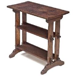 Roycroft Little Journey's stand, rectangular top over two lower shelves, supported by keyed-tenon construction, lightly recoated original finish, some stains to top, signed with metal plate, 26”w x 14”d x 26”h