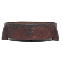 Rare Roycroft bowl, three foothed form wrapped in leather with tooled Arts & Crafts design, impressed mark, 8”w, some loss to leather, very unusual