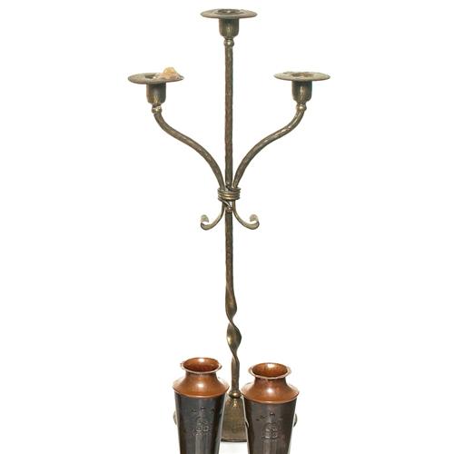 Roycroft candelabra, brash wash over copper, hammered copper with three holders and a twisted stem, original patina, marked, 20"h