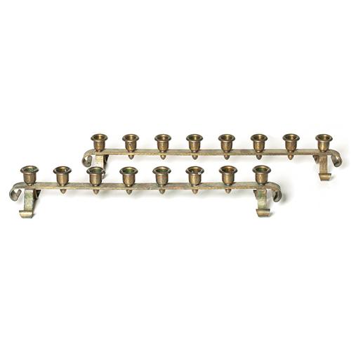 Roycroft candelabras, pair, low form in hammered copper with eight holders, original patina, impressed mark, 20"l