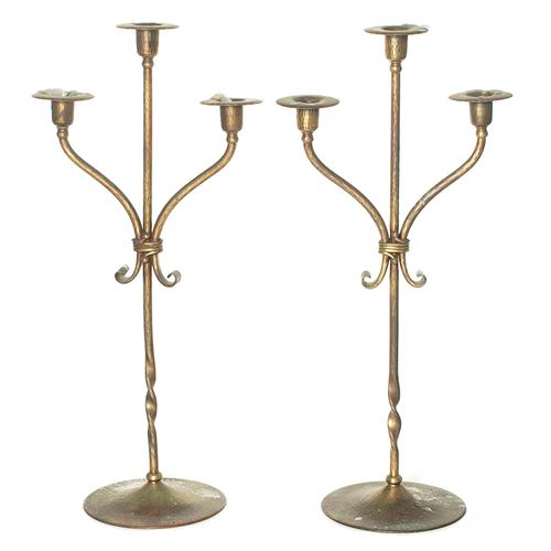 Roycroft candelabras, two, brash wash over copper with three holders and a twisted stem, original patina, impressed mark, 20"h