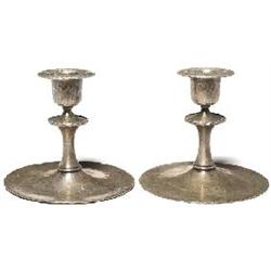 Roycroft candlesticks, pair, hammered copper with original nickel plating, marked, 3.5”h, minor wear