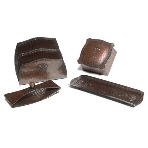Roycroft desk set, four pieces, all in hammered copper, original patina, marked, largest is 7"l