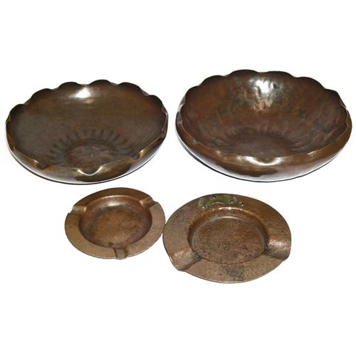 Roycroft tray, marked, 4"w; with an Arts & Crafts tray, (not shown), metal designs, 5"w; with Craftsman bowls, (not shown), two, marked, largest is 8"w, all in hammered copper, all original patina